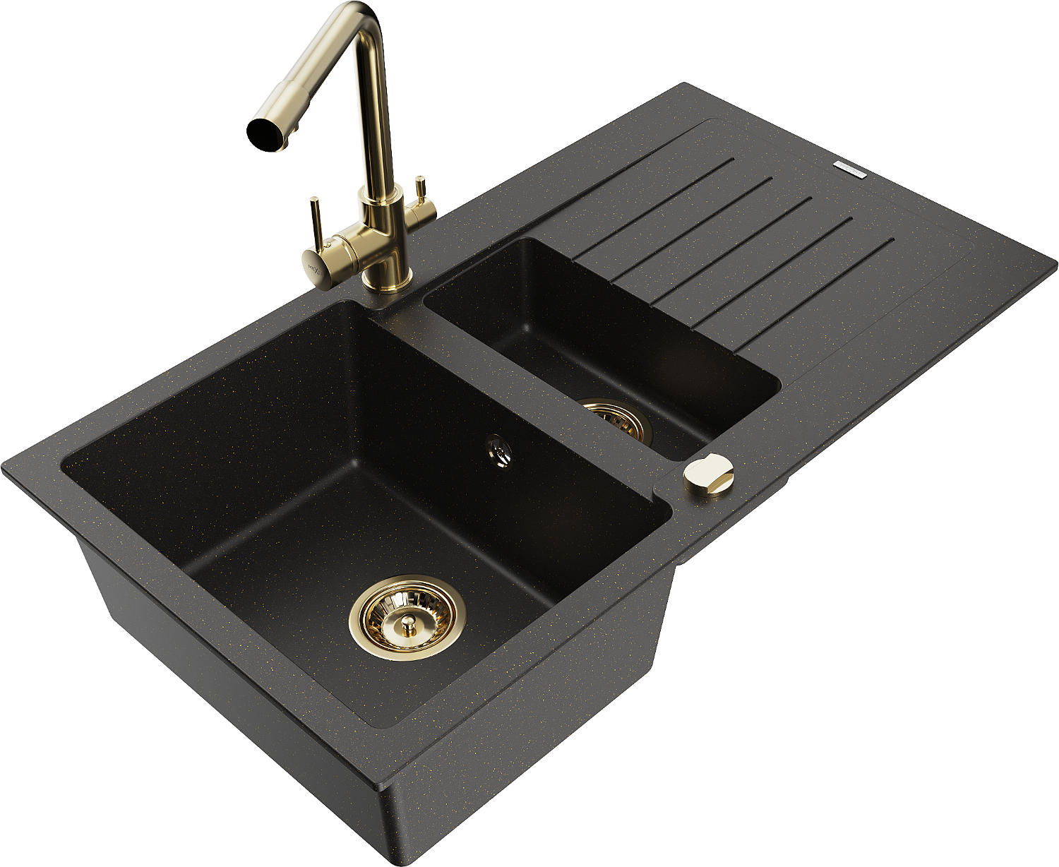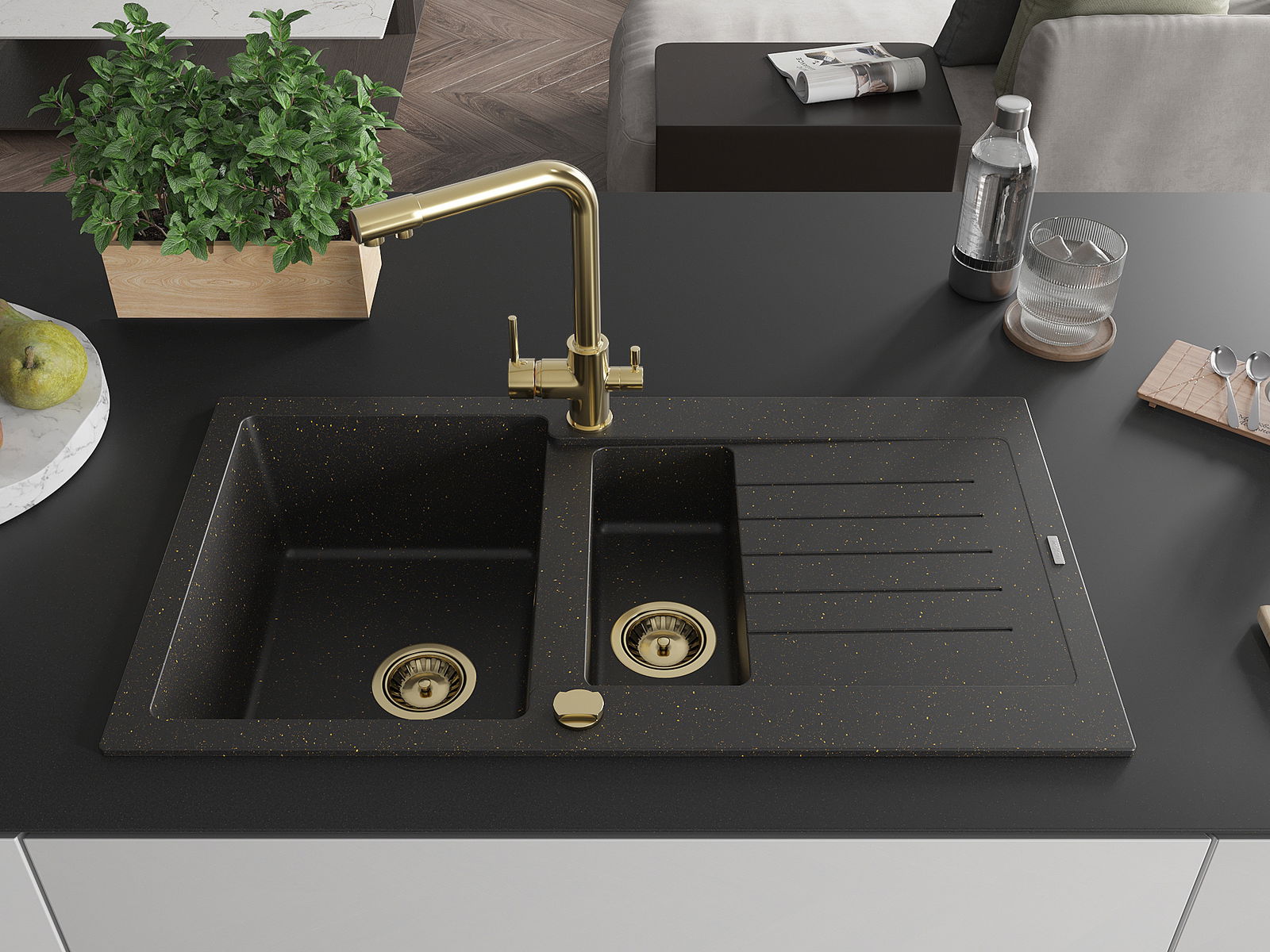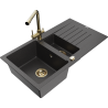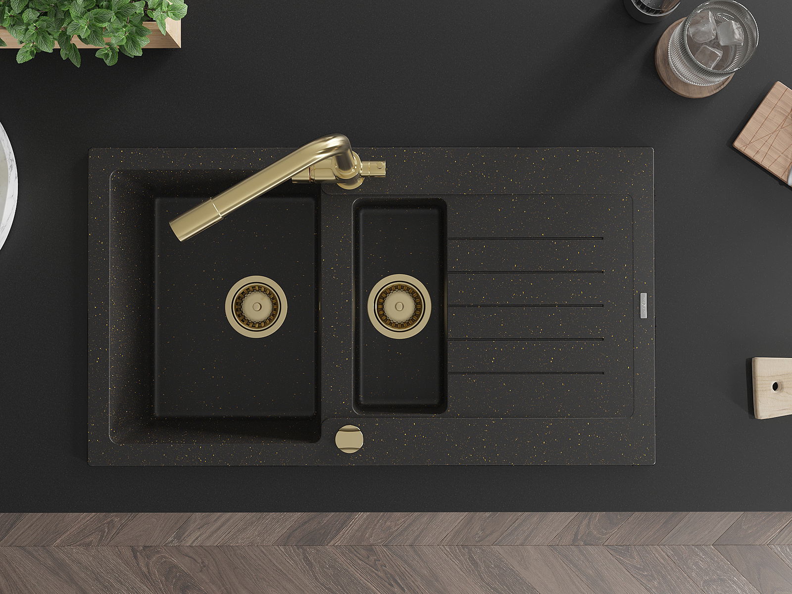 Mexen Matias granite sink 1.5-bowl with drainer and Duero kitchen tap, black/gold metallic - 6502-75-671600-50