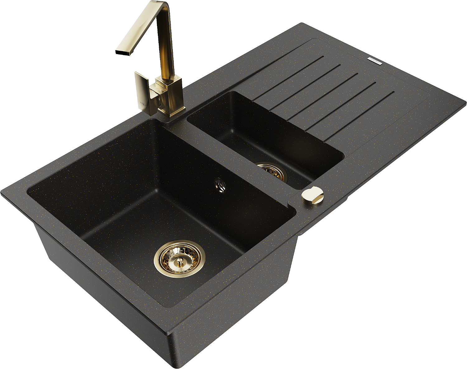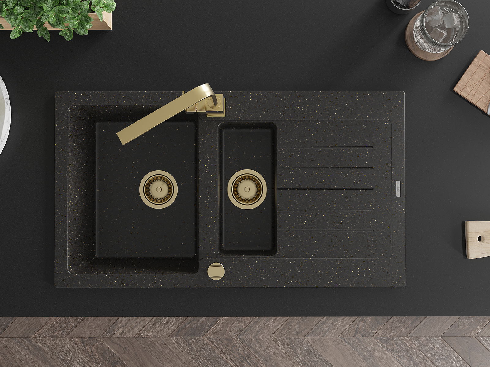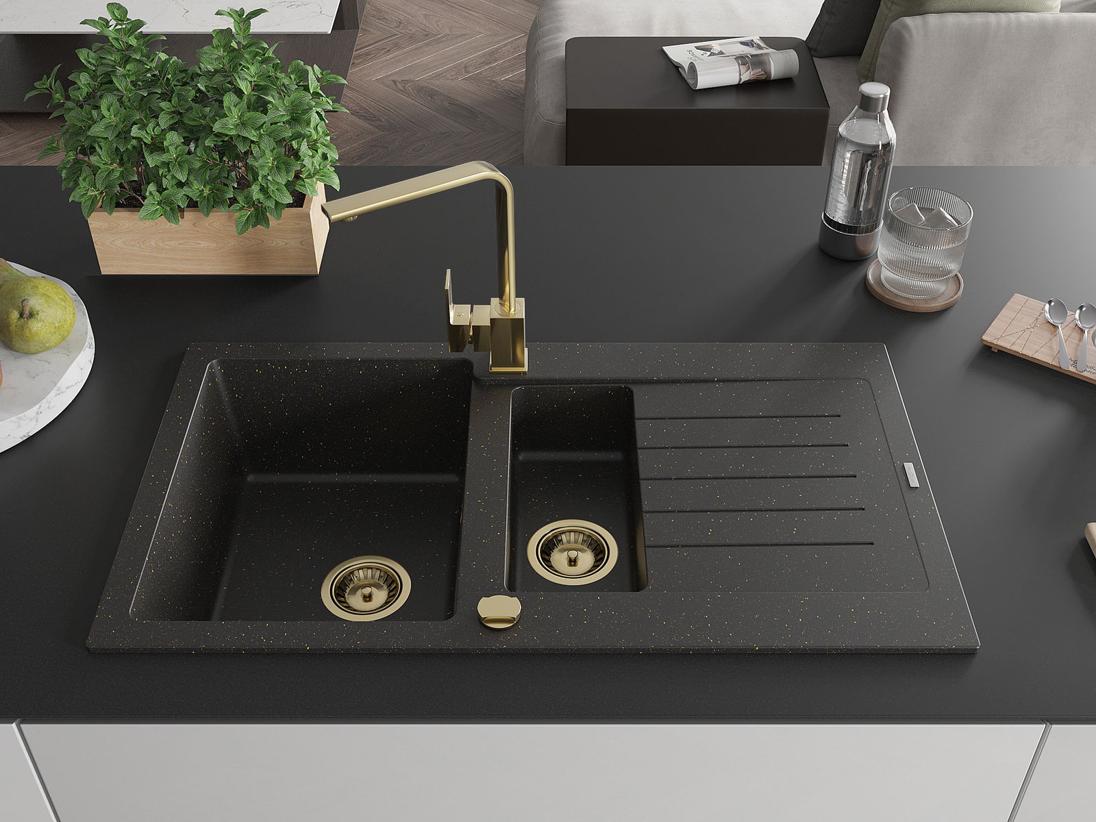 Mexen Matias granite sink 1.5-bowl with drainer and Rita kitchen tap, black/gold - 6502-75-670300-50