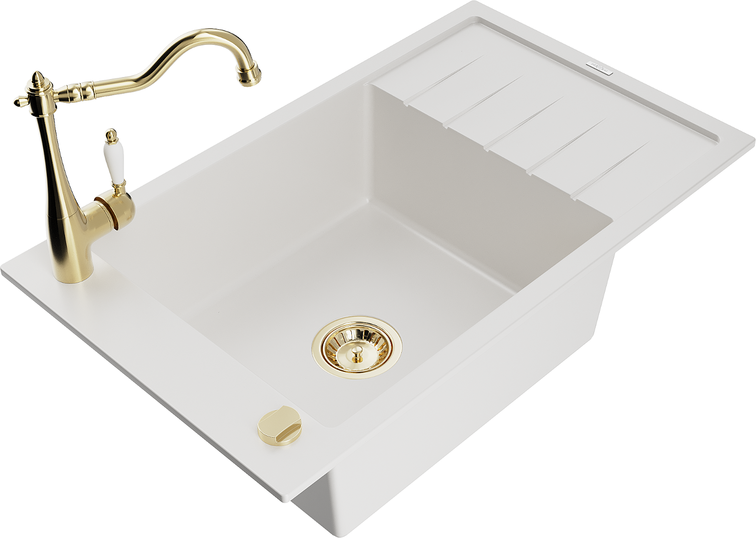 Mexen Elias granite sink 1-bowl with drainer and Carla kitchen tap, white - 6511-20-670700-50