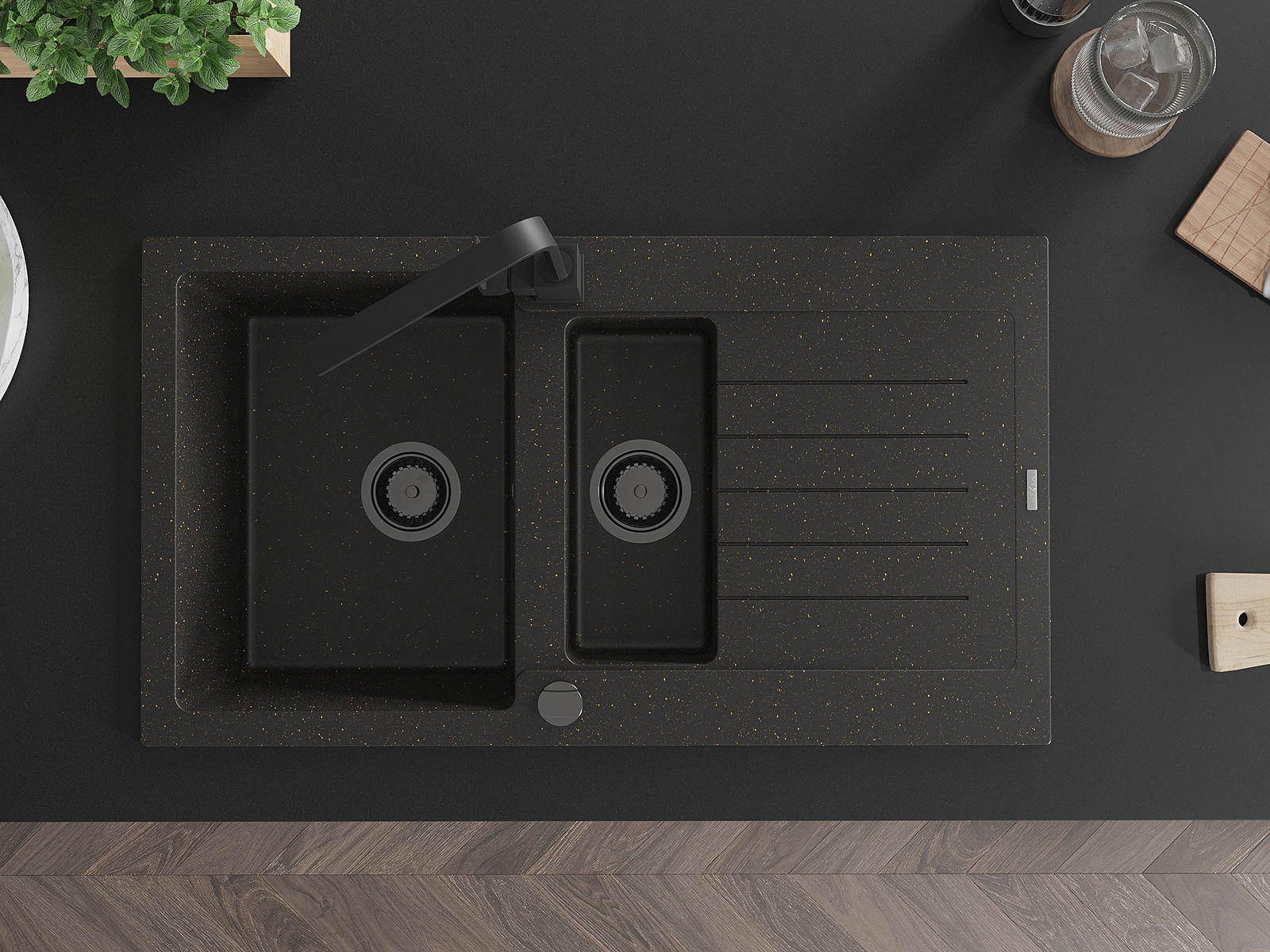Mexen Matias 1.5-Bowl Granite Kitchen Sink with Drainer and Rita Kitchen Tap, Black/Gold - 6502-75-670300-70-B