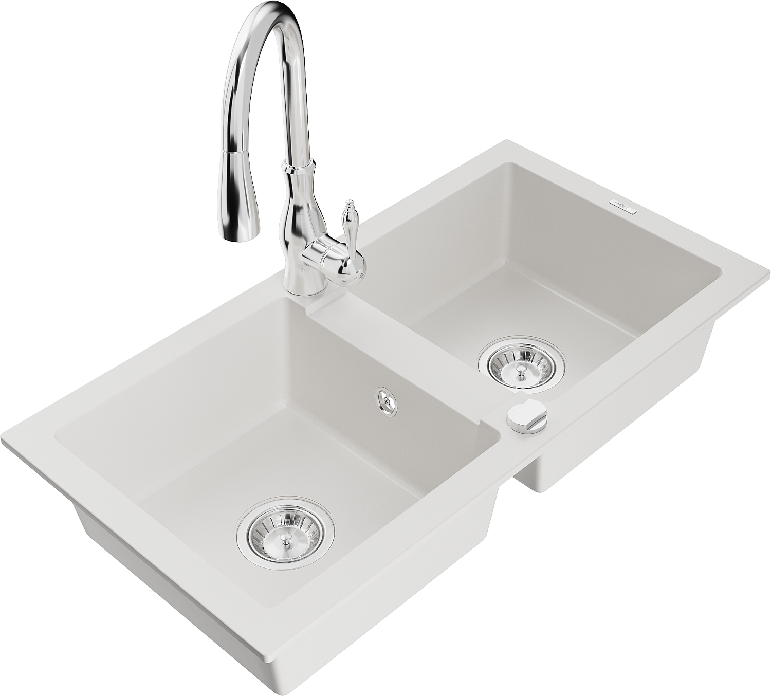 Mexen Mario granite sink 2-chamber with Savita kitchen tap, white - 6504-20-672601-00