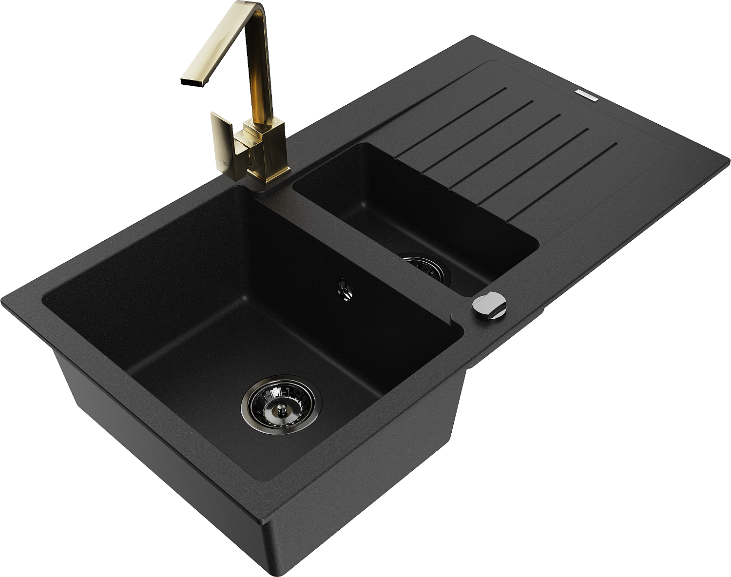 Mexen Matias granite sink 1.5-bowl with drainer and Rita kitchen tap, black - 6502-77-670300-50-B