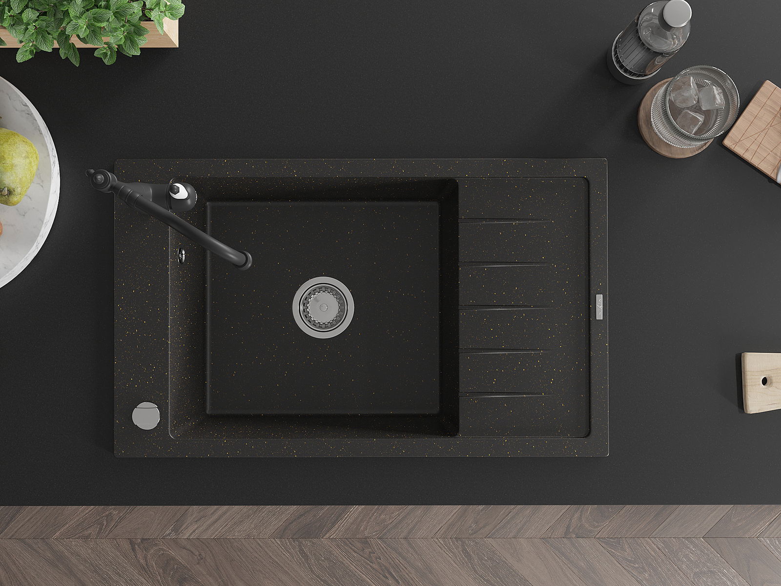 Mexen Elias 1-bowl granite sink with drainer and Carla kitchen tap, black/gold metallic - 6511-75-670700-70