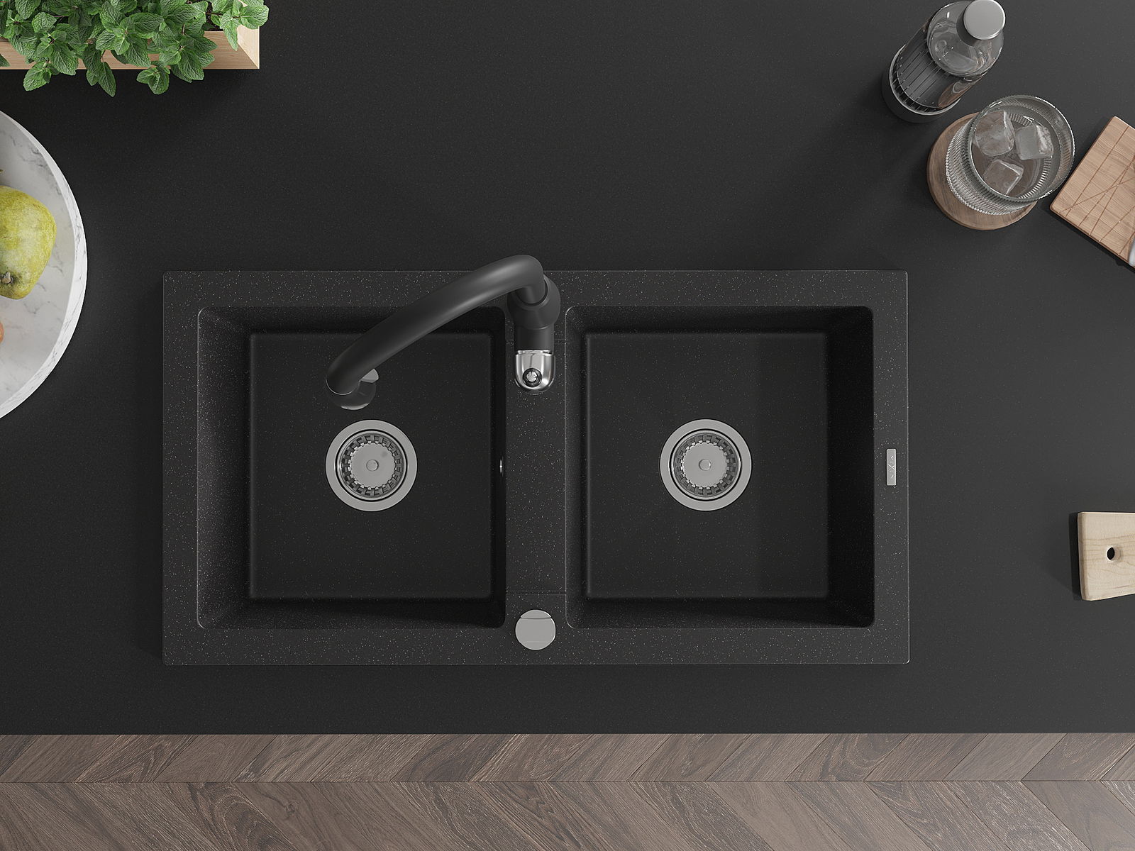 Mexen Mario granite 2-bowl sink with Savita kitchen tap, black/silver metallic - 6504-73-672601-70