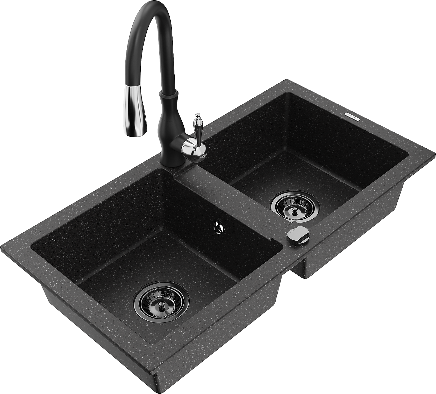Mexen Mario granite kitchen sink, 2-bowl with Savita kitchen tap, black/silver metallic - 6504-73-672601-70-B