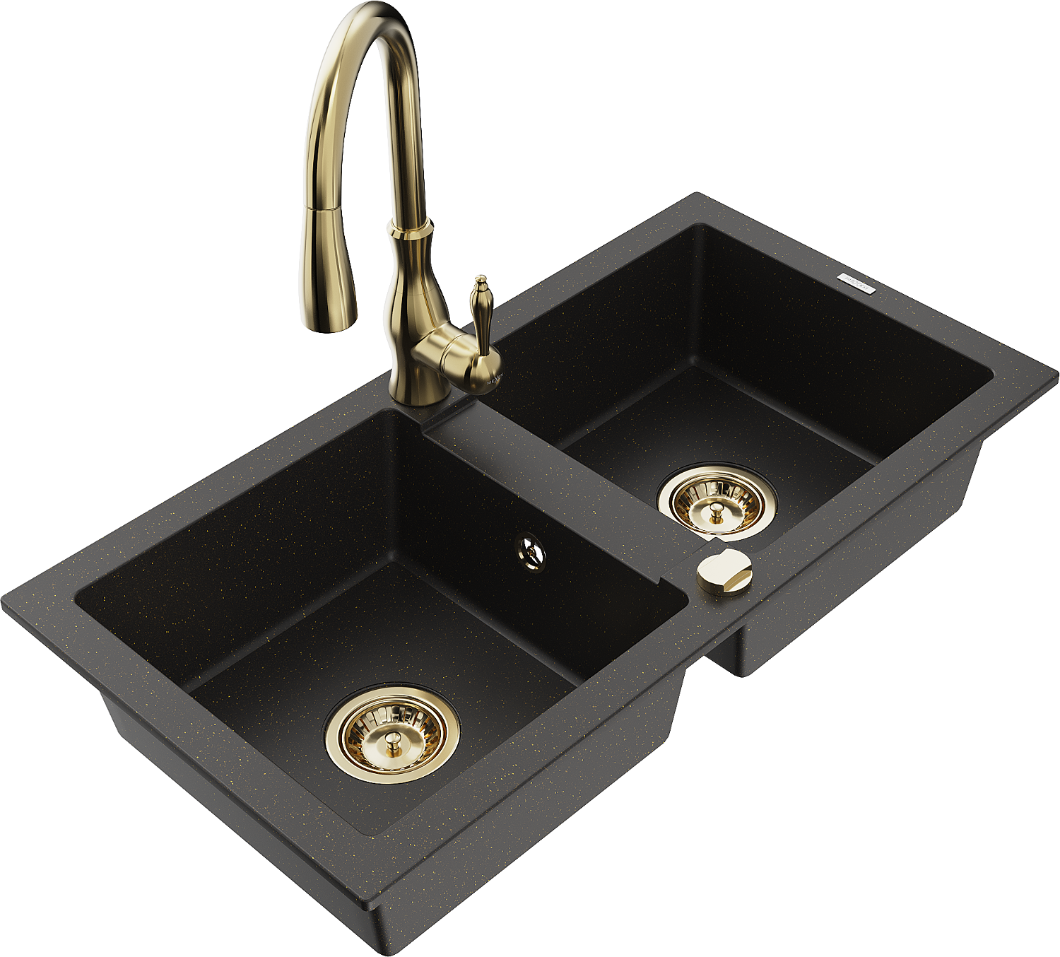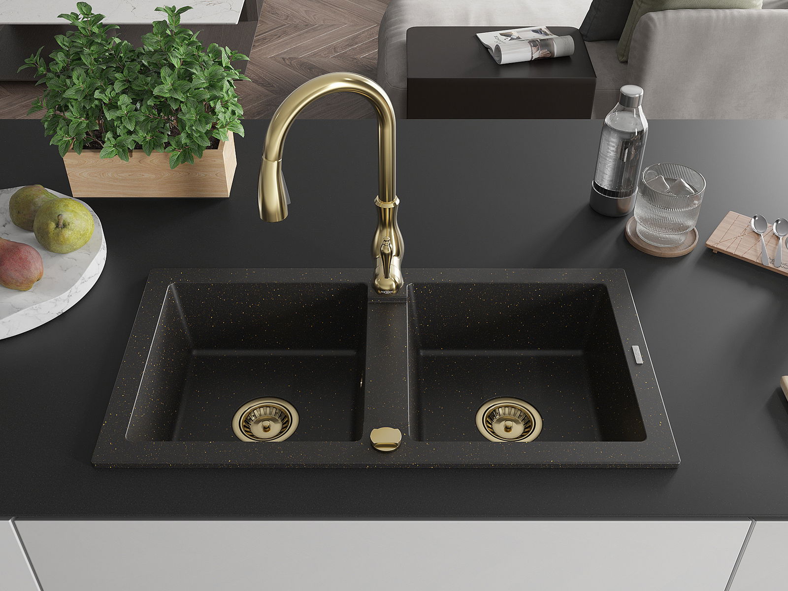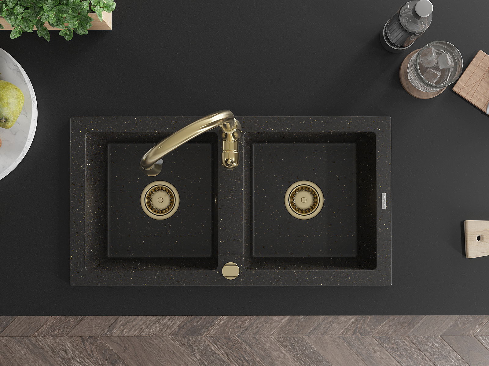 Mexen Mario granite double sink with Savita kitchen tap, black/gold metallic - 6504-75-672601-50