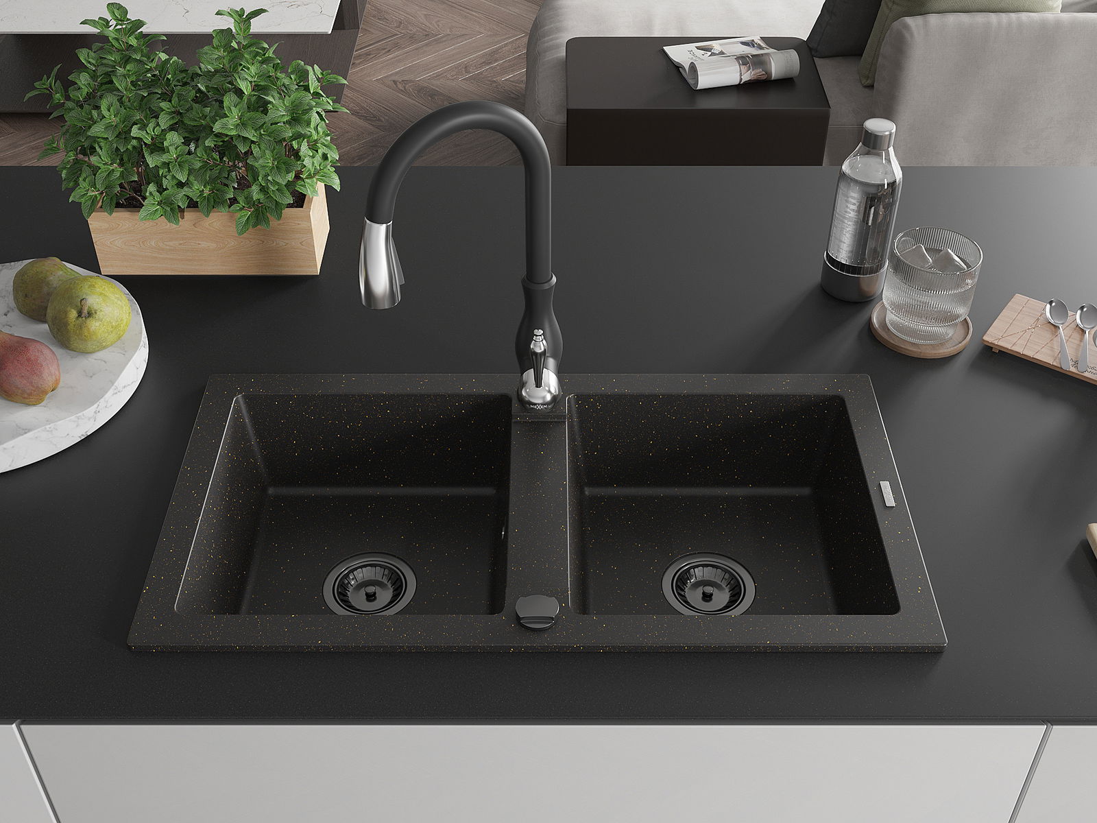 Mexen Mario granite kitchen sink 2-bowl with Savita kitchen tap, black/golden metallic - 6504-75-672601-70-B