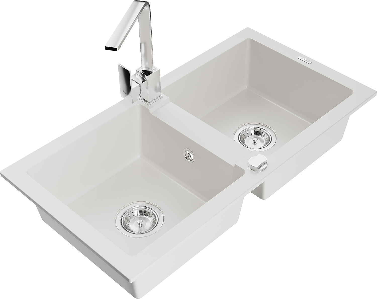 Mexen Mario granite sink 2-bowl with Rita kitchen tap, white - 6504-20-670300-00