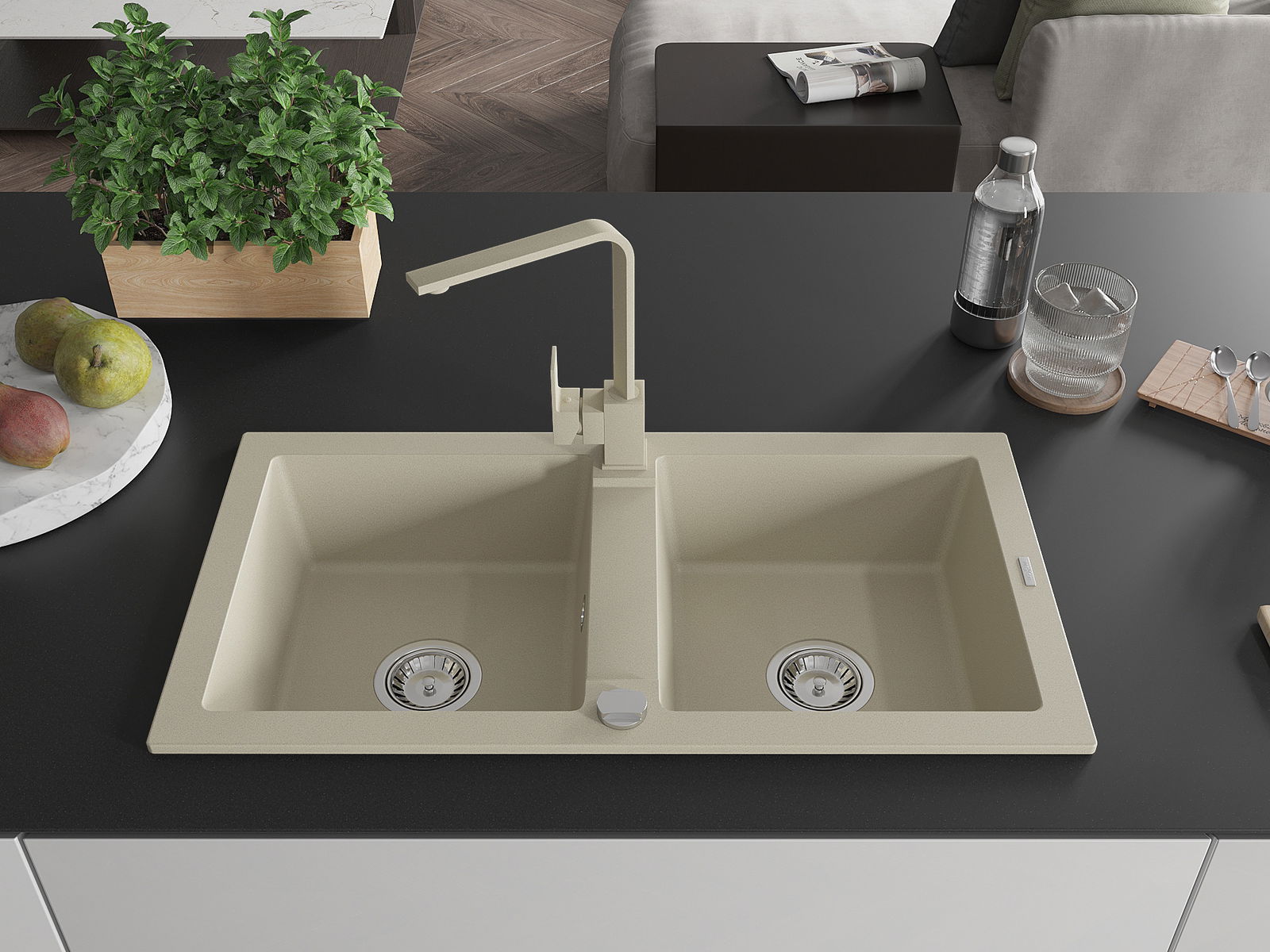 Mexen Mario granite sink 2-bowl with Rita kitchen tap, beige - 6504-69-670300-69