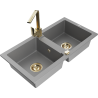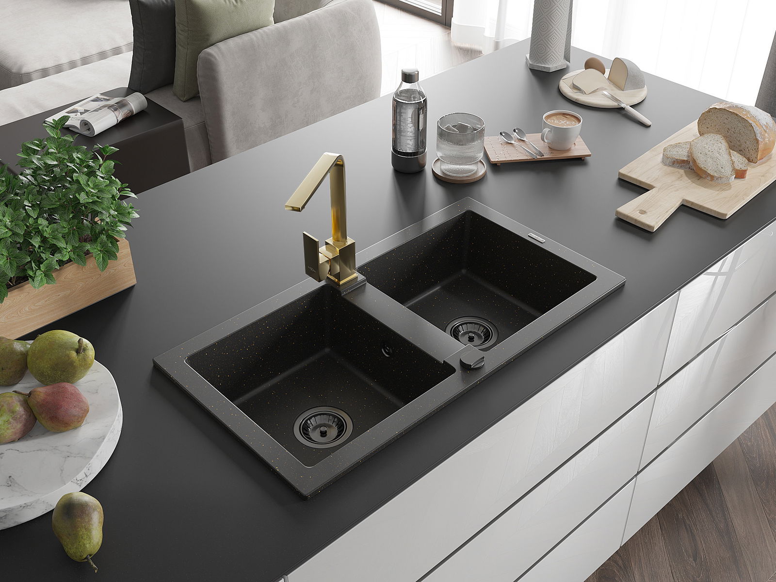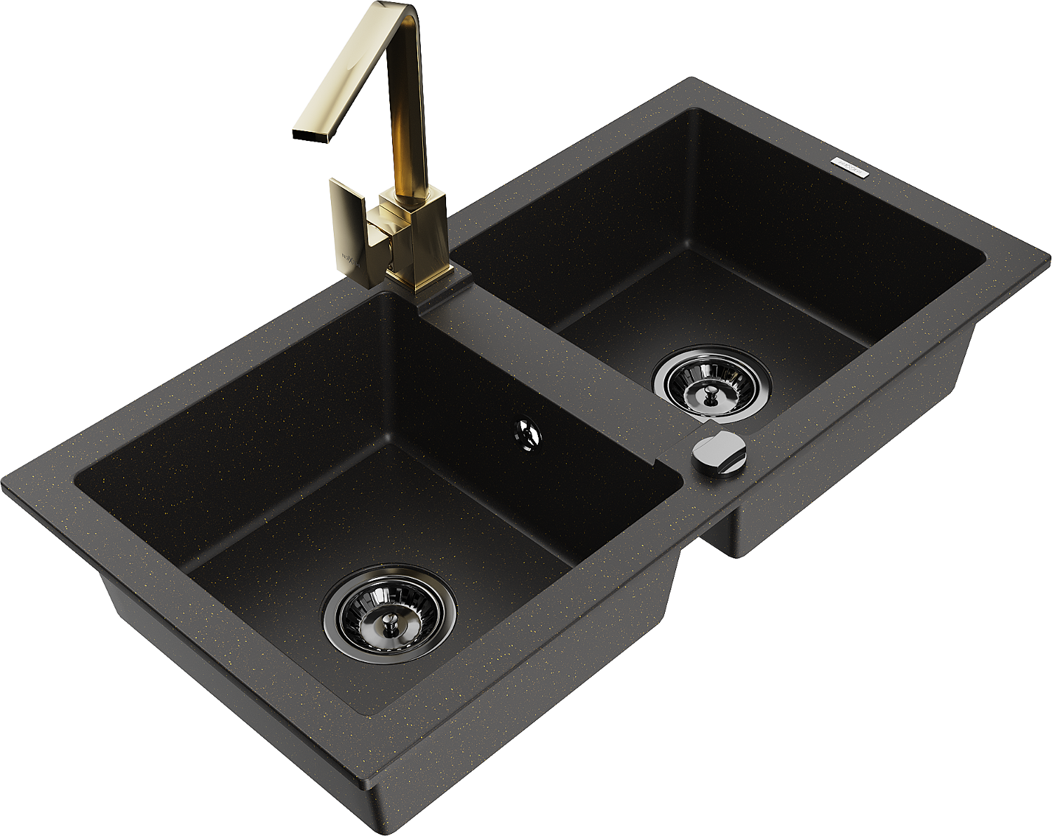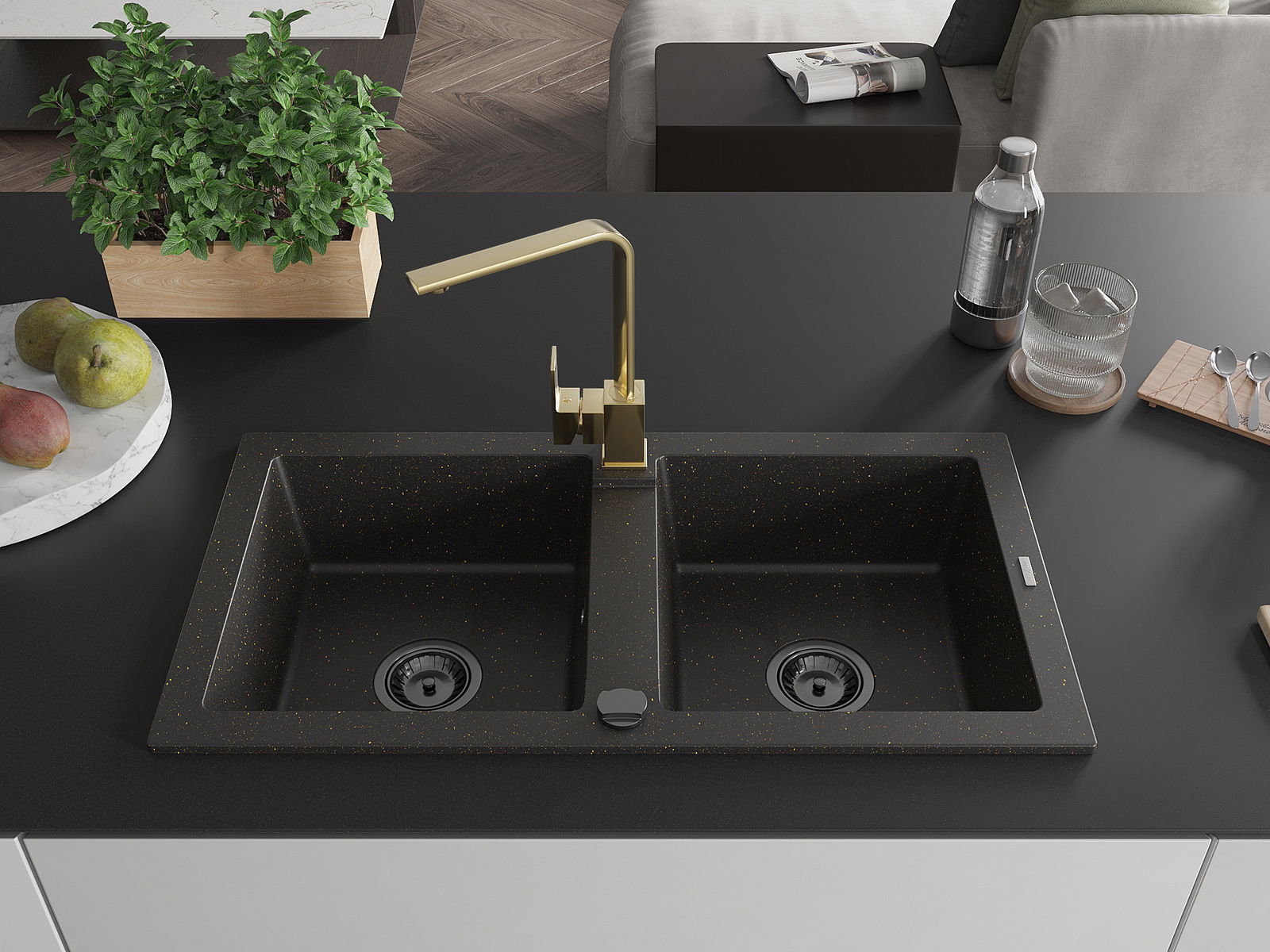 Mexen Mario 2-bowl granite sink with Rita kitchen tap, black/gold metallic - 6504-75-670300-50-B