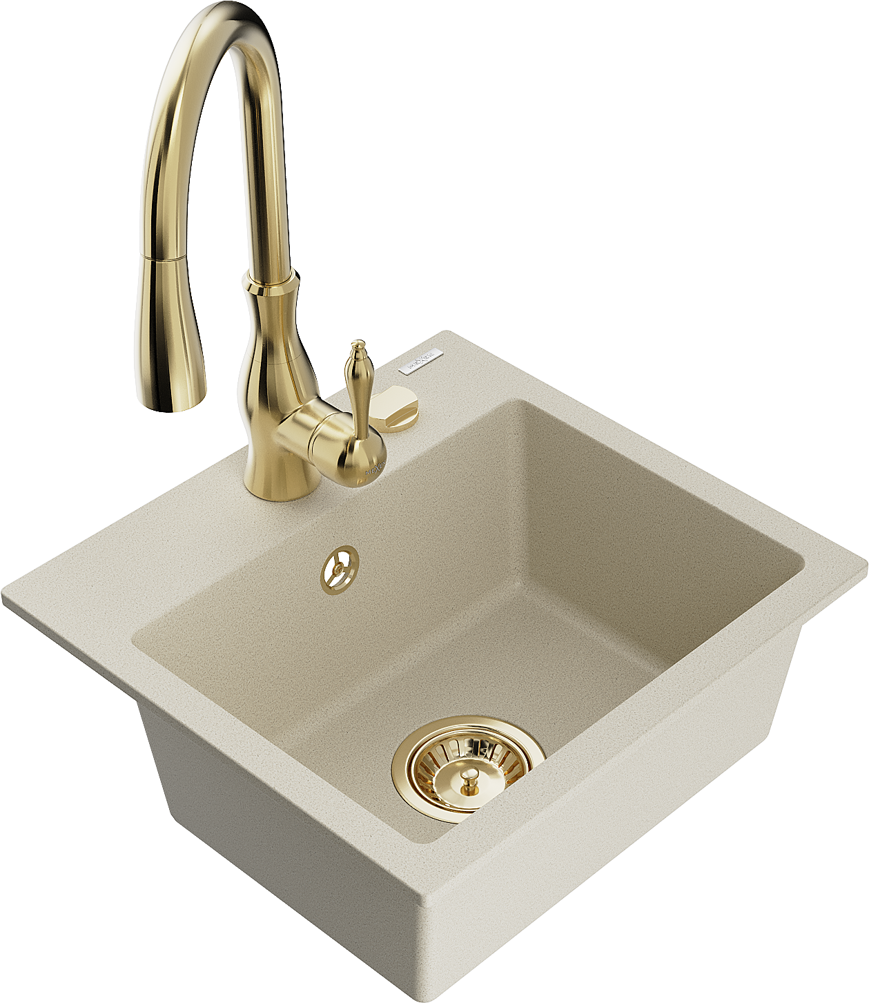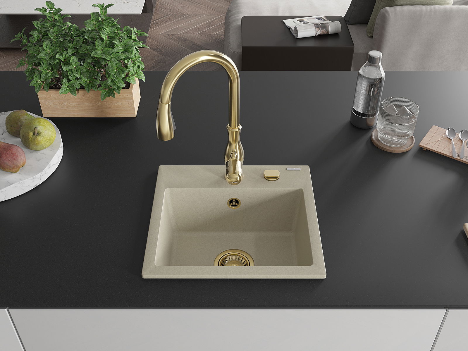 Mexen Milo granite sink with 1 bowl and Savita kitchen tap, beige - 6505-69-672601-50