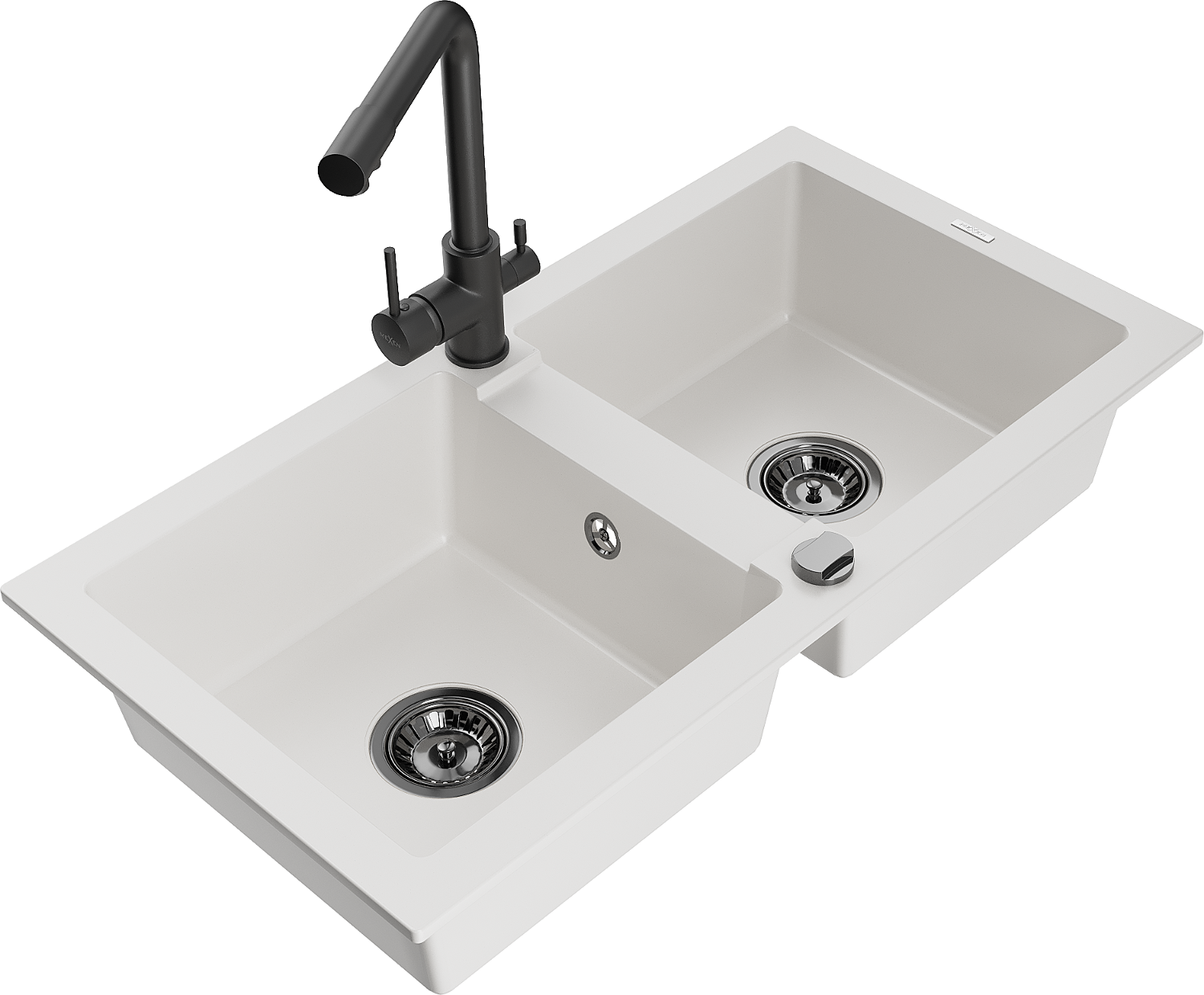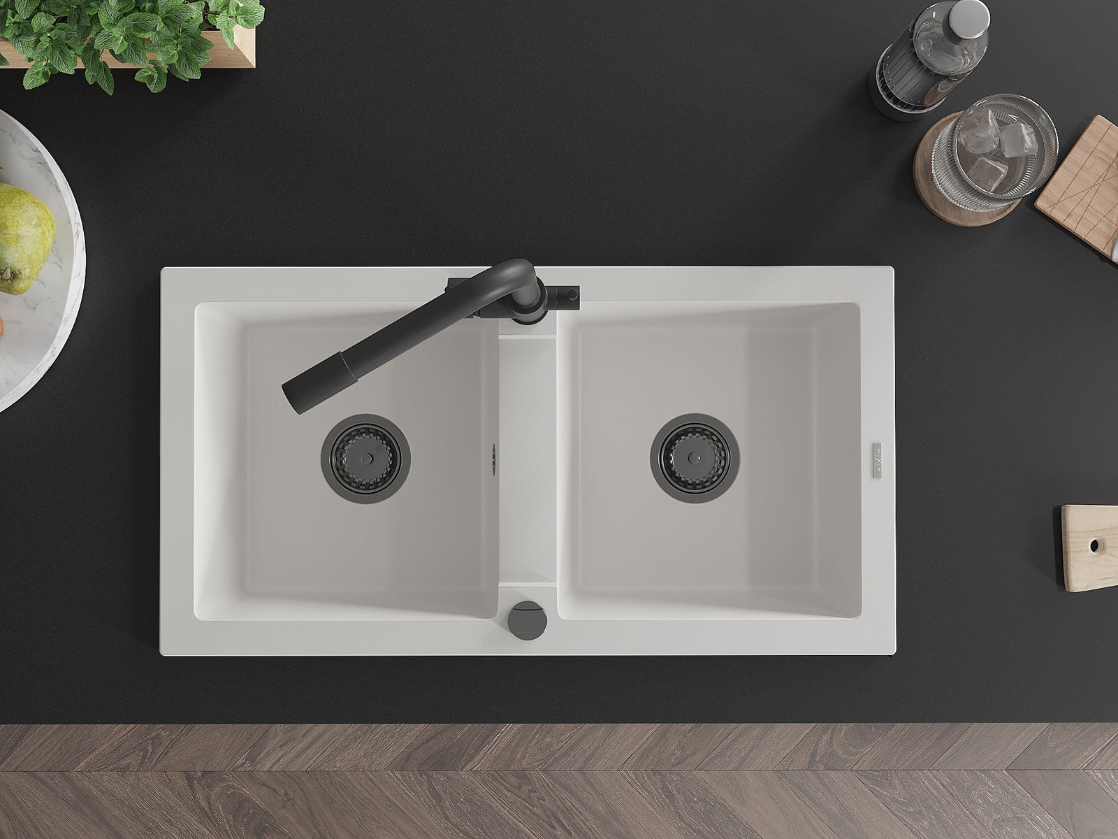 Mexen Mario 2-bowl granite sink with Duero kitchen tap, white - 6504-20-671600-70