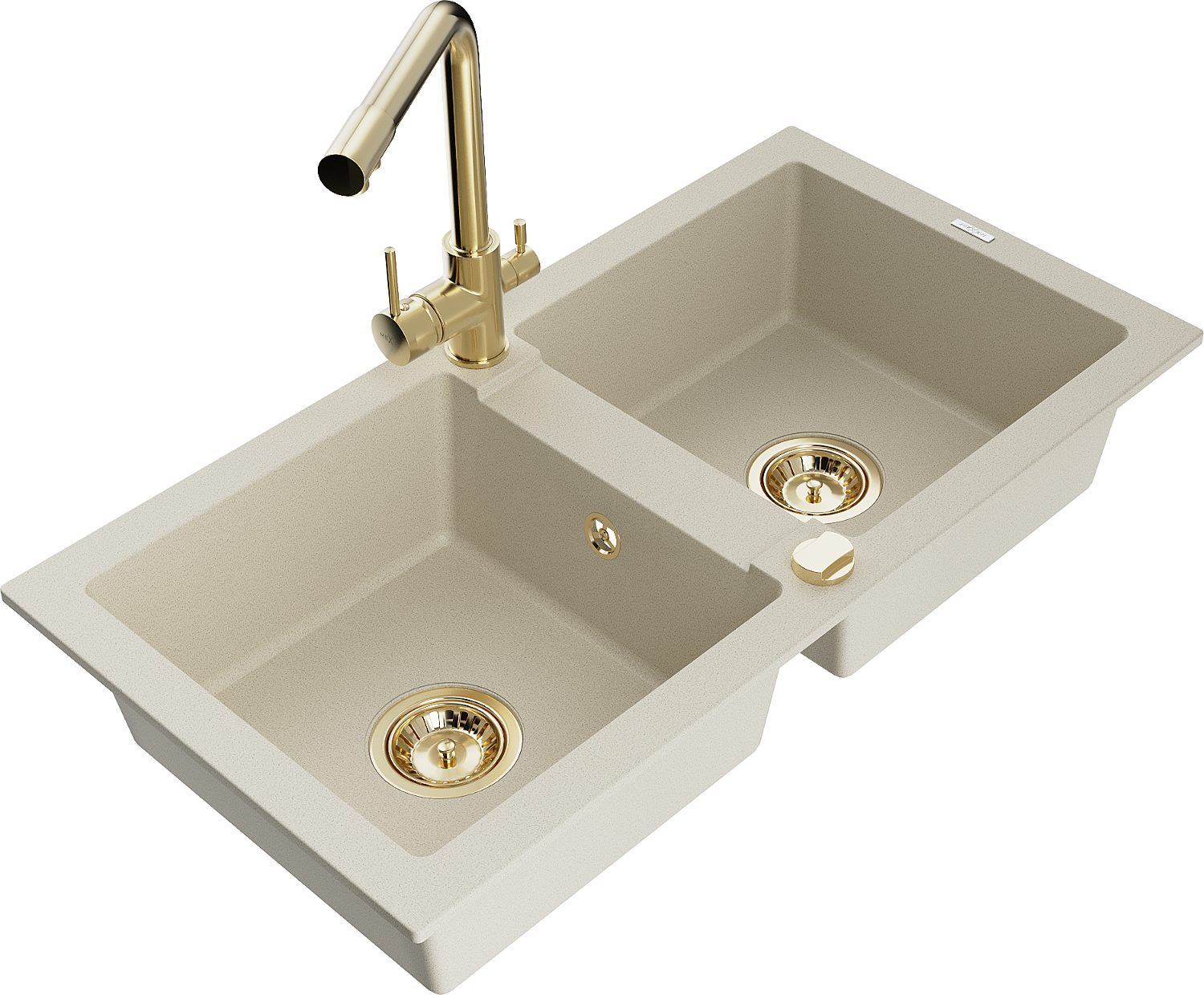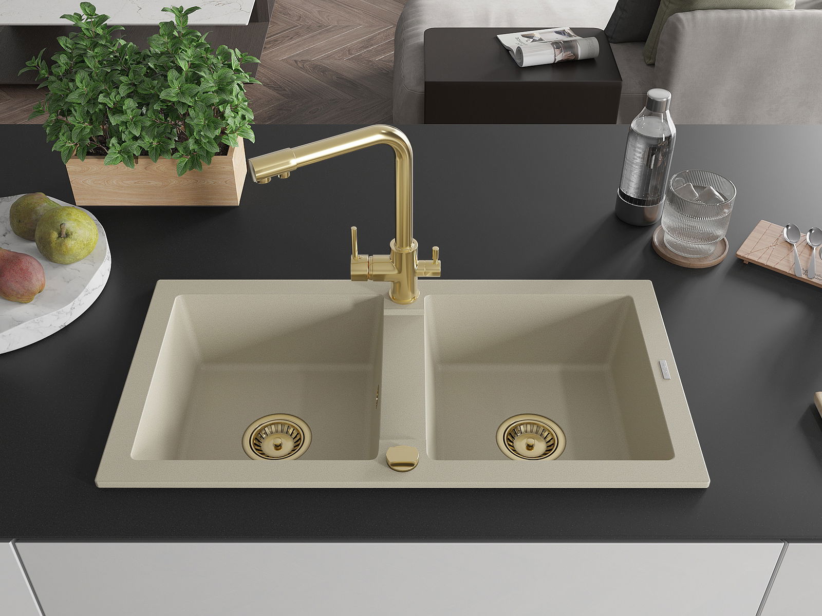 Mexen Mario granite kitchen sink 2-bowl with Duero kitchen tap, beige - 6504-69-671600-50
