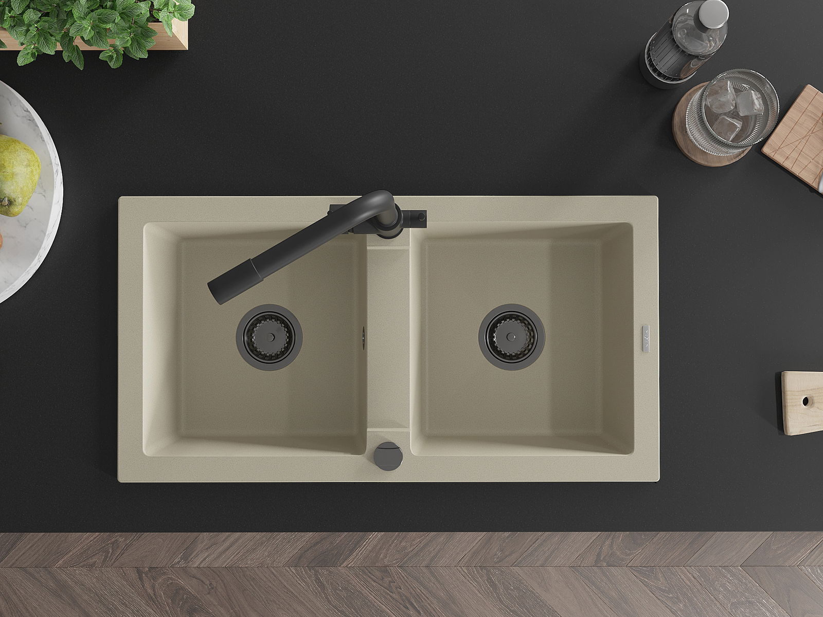 Mexen Mario granite kitchen sink 2-bowl with Duero kitchen tap, beige - 6504-69-671600-70
