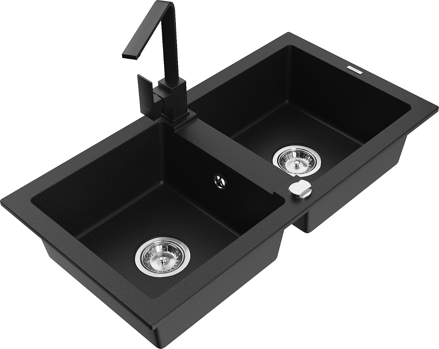 Mexen Mario Granite Kitchen Sink 2-Bowl with Rita Kitchen Tap, Black - 6504-77-670300-70