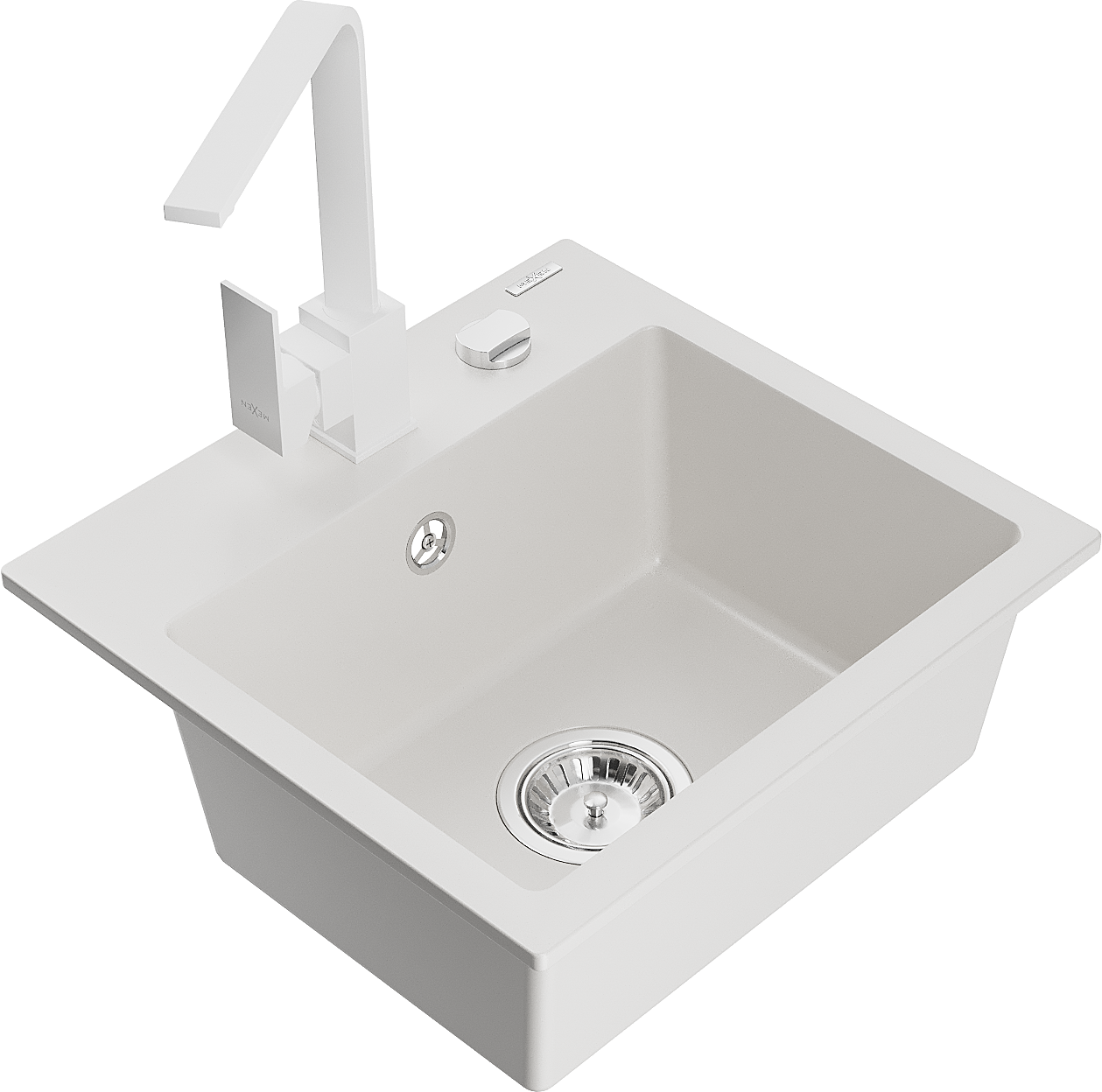 Mexen Milo granite kitchen sink 1-bowl with Rita kitchen tap, white - 6505-20-670300-20