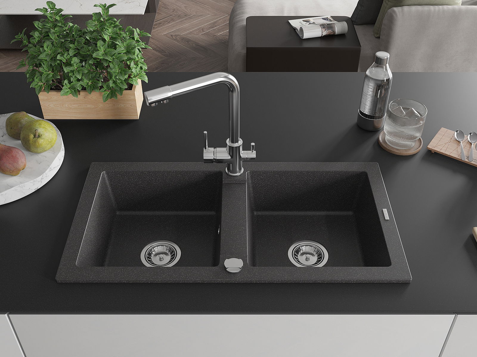 The sink is made of high quality granite. It is an elegant and, above all, practical complement to every kitchen, regardless of its style. High quality and granite durability ensure many years of use.