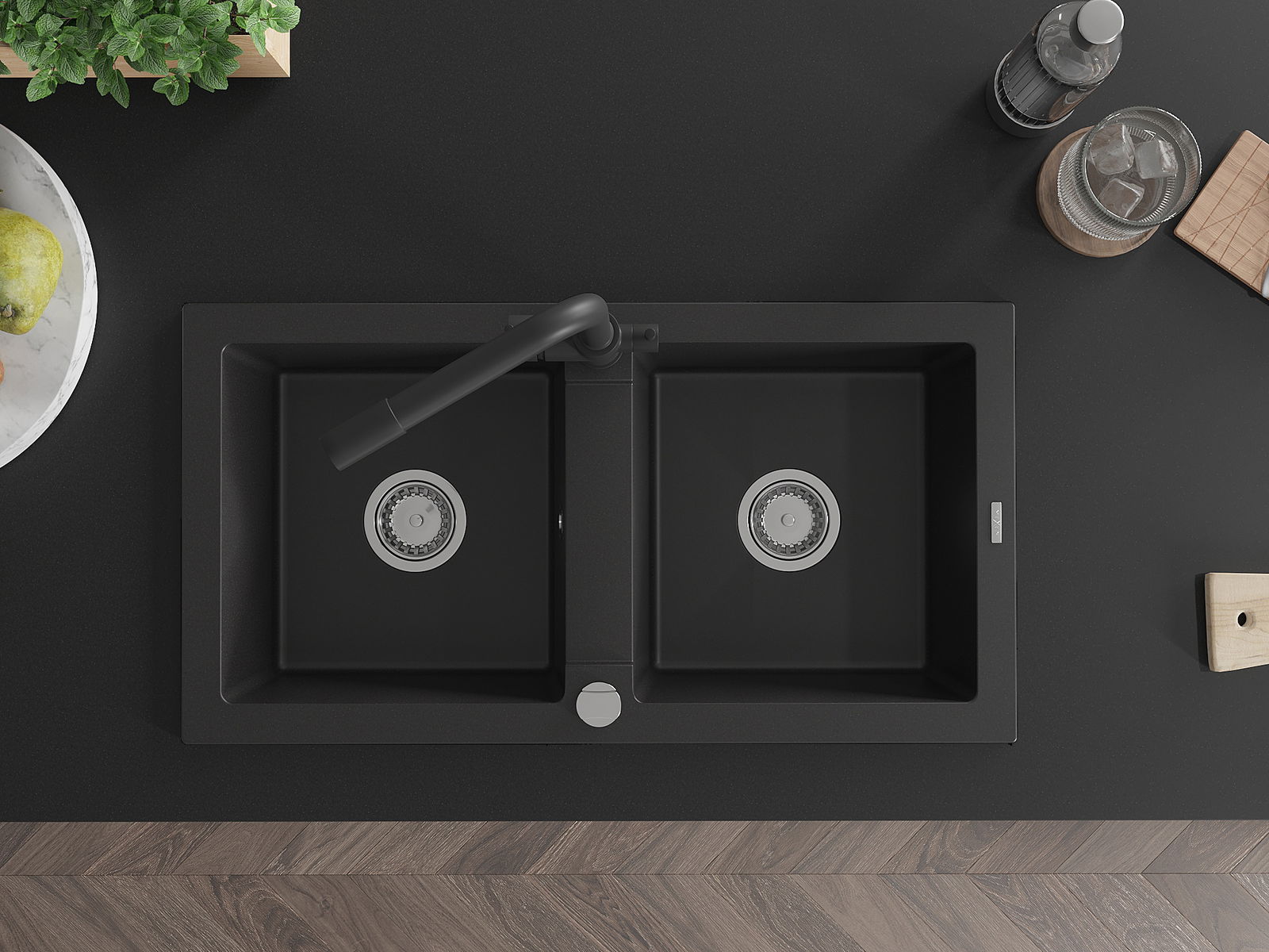 Mexen Mario granite sink 2-compartment with Duero kitchen tap, black - 6504-77-671600-70