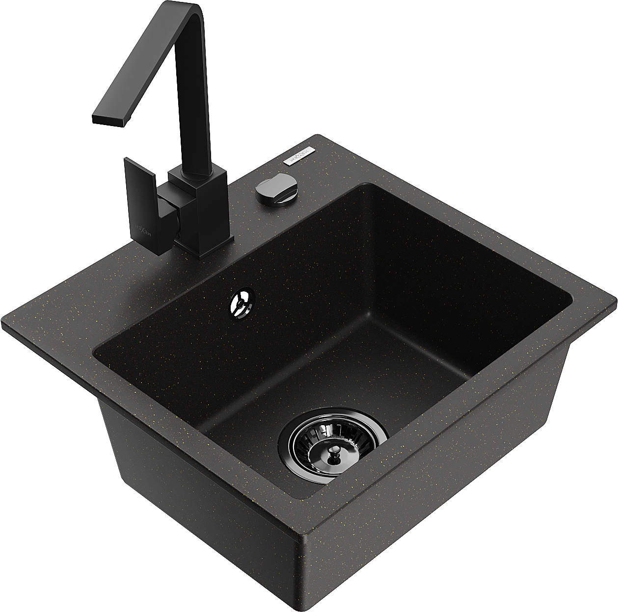 Mexen Milo 1-bowl granite kitchen sink with Rita tap, black/gold metallic - 6505-75-670300-70-B