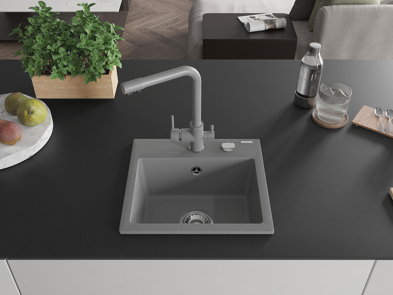 Mexen Milo 1-bowl granite sink with Duero kitchen tap, grey - 6505-71-671600-71