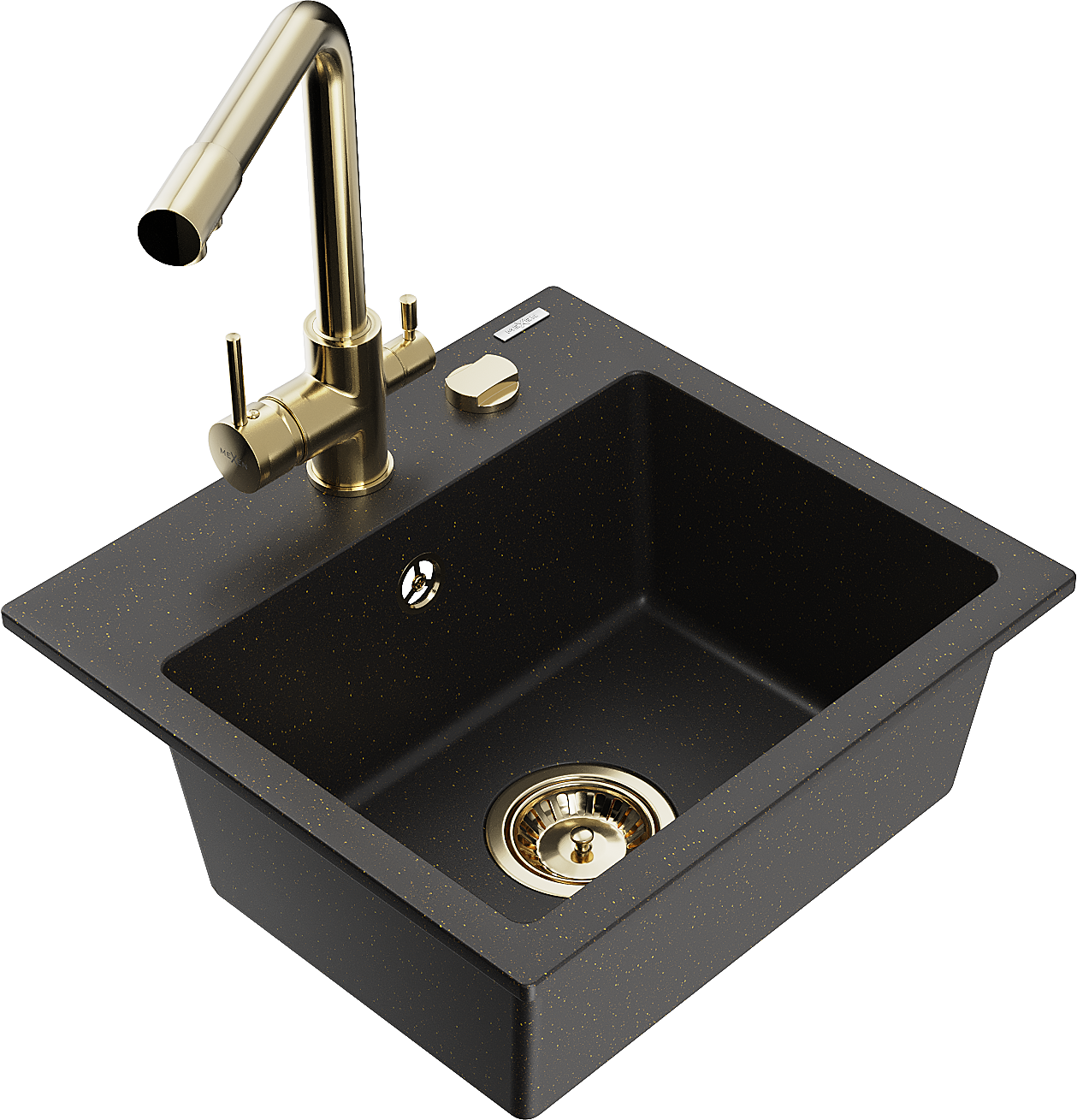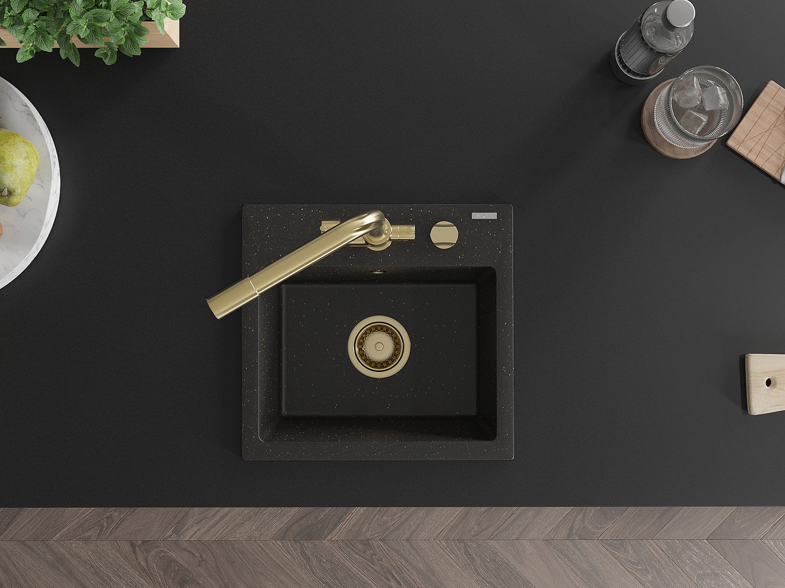 Mexen Milo 1-bowl granite kitchen sink with Duero tap, black/gold metallic - 6505-75-671600-50