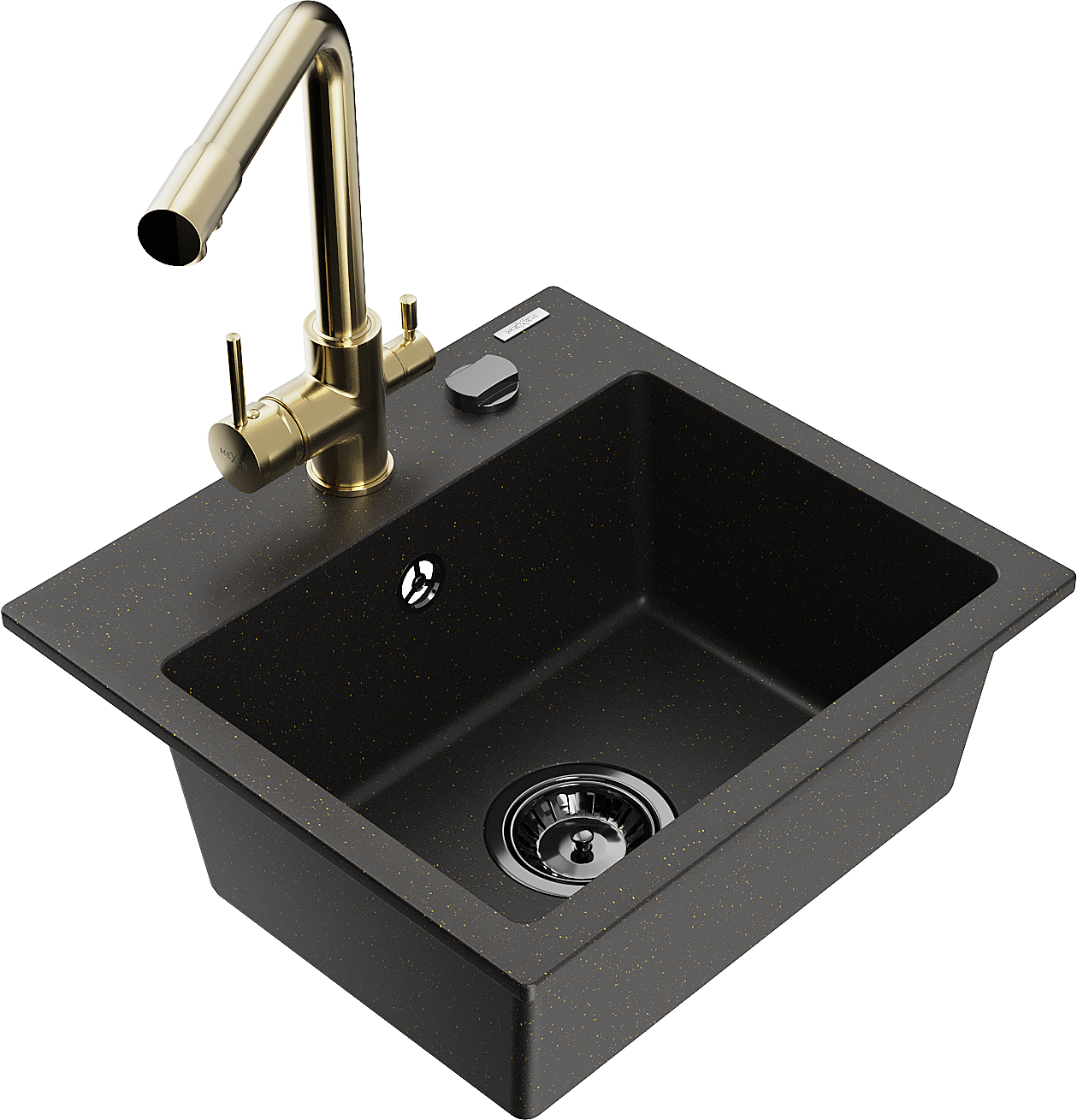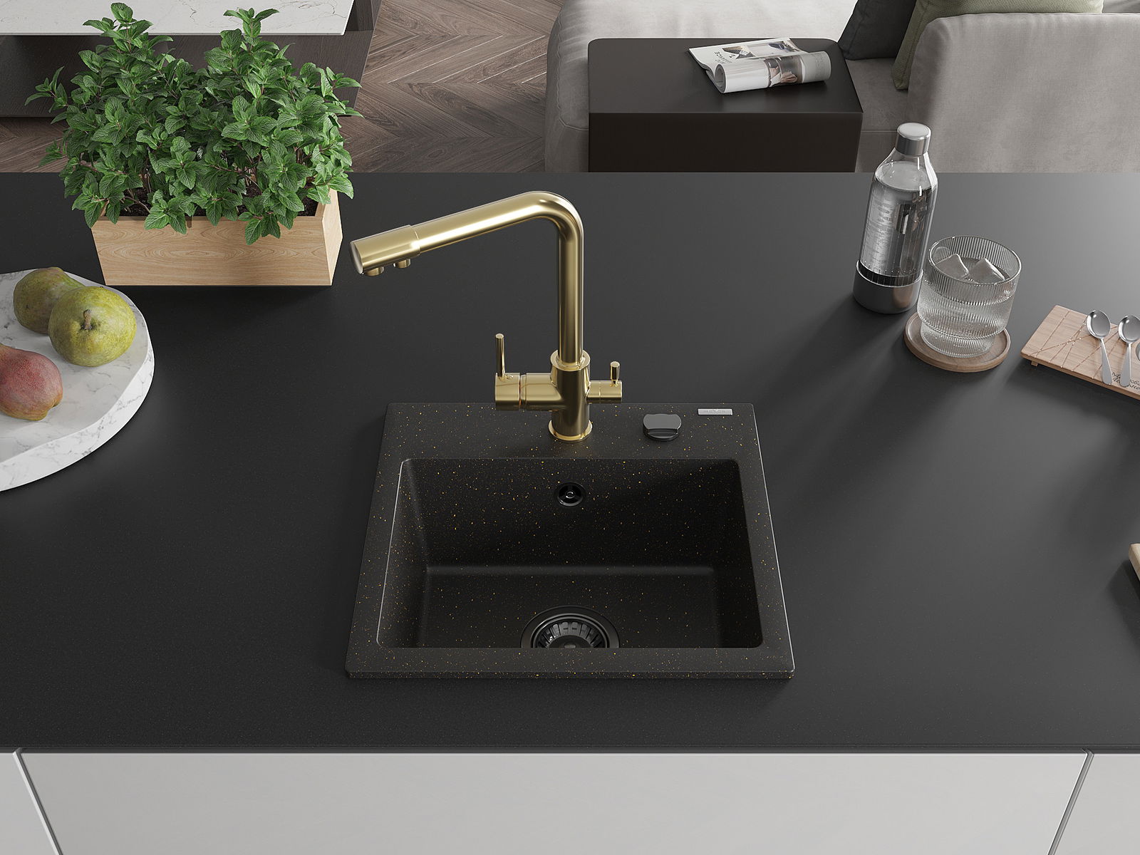 Mexen Milo 1-bowl granite sink with Duero kitchen tap, black/gold metallic - 6505-75-671600-50-B