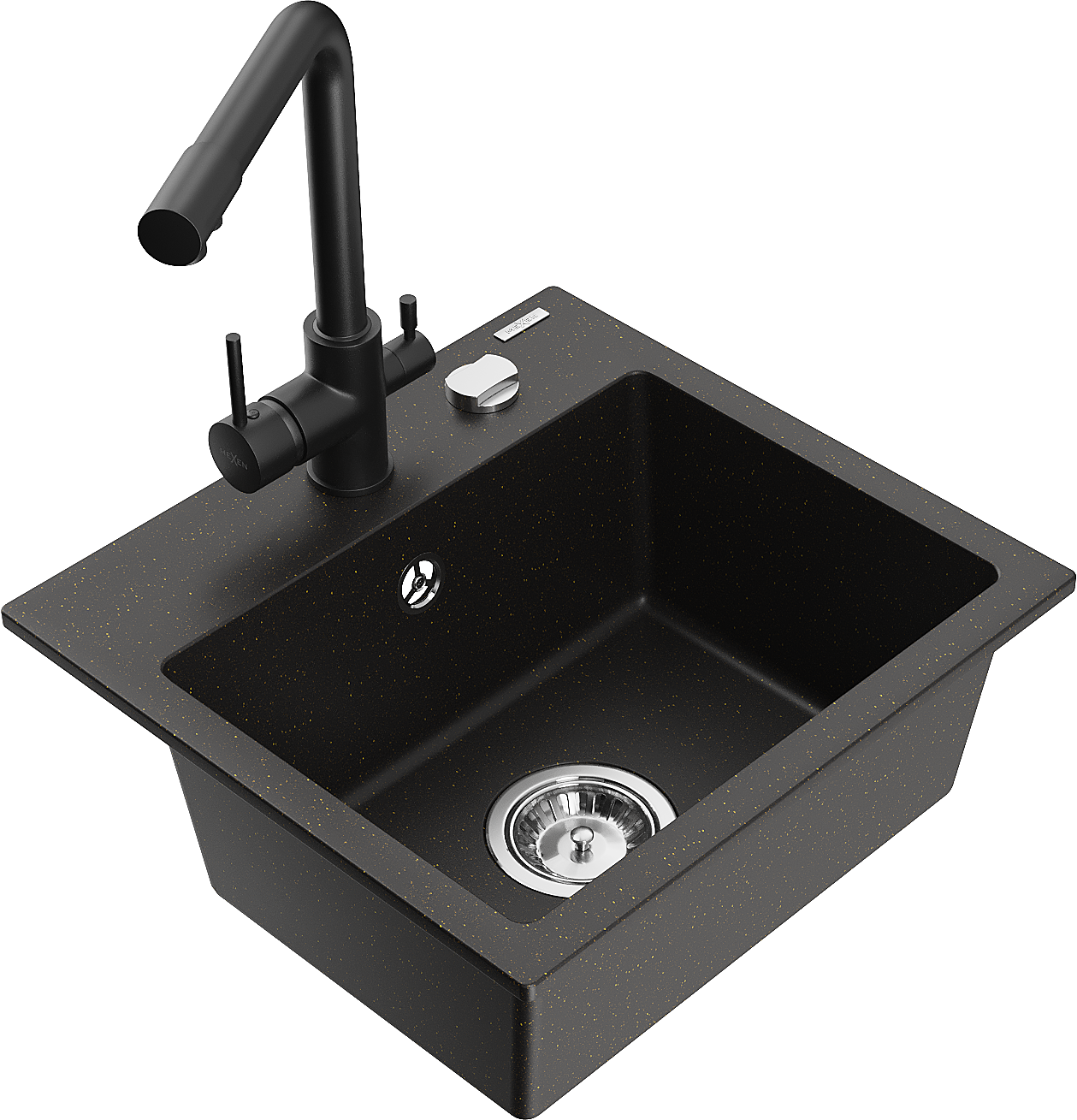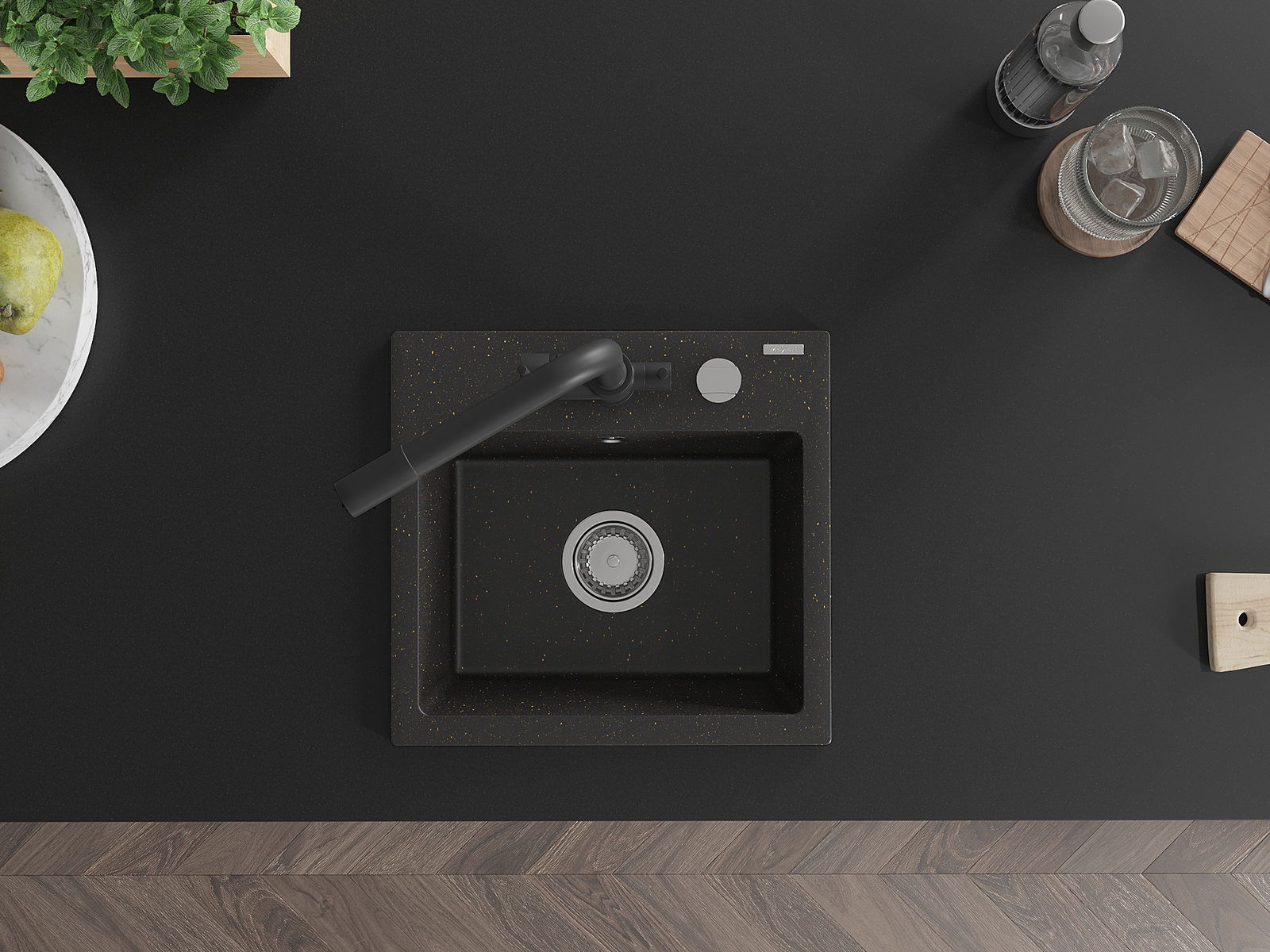 Mexen Milo granite sink 1-bowl with Duero kitchen tap, black/gold metallic - 6505-75-671600-70