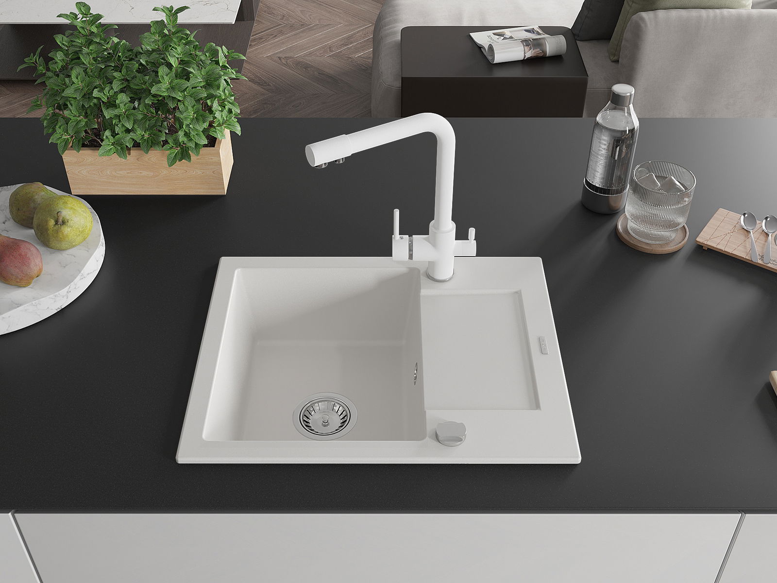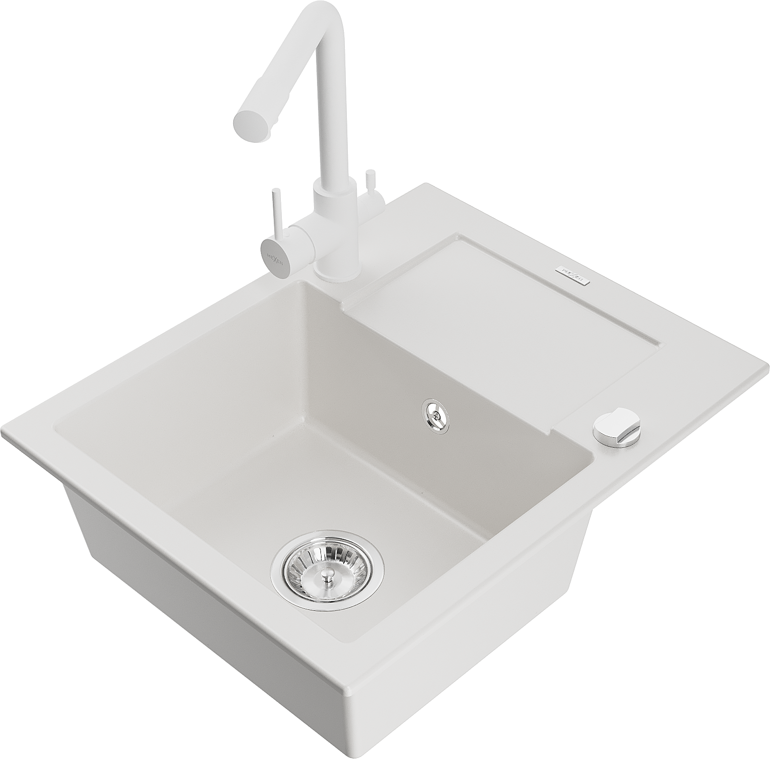 Mexen Enzo granite sink 1-bowl with drainer and Duero kitchen tap, white - 6506-20-671600-20
