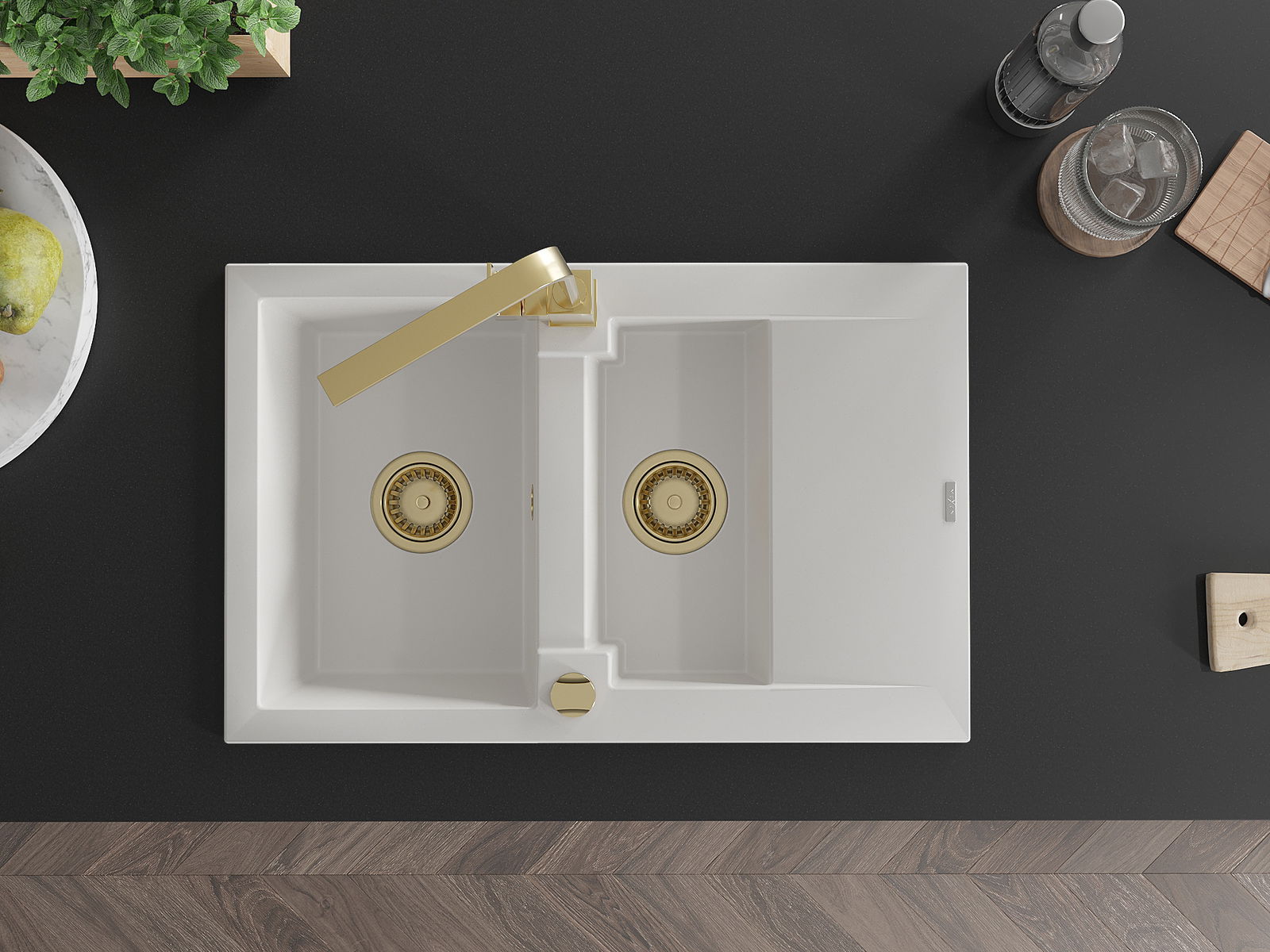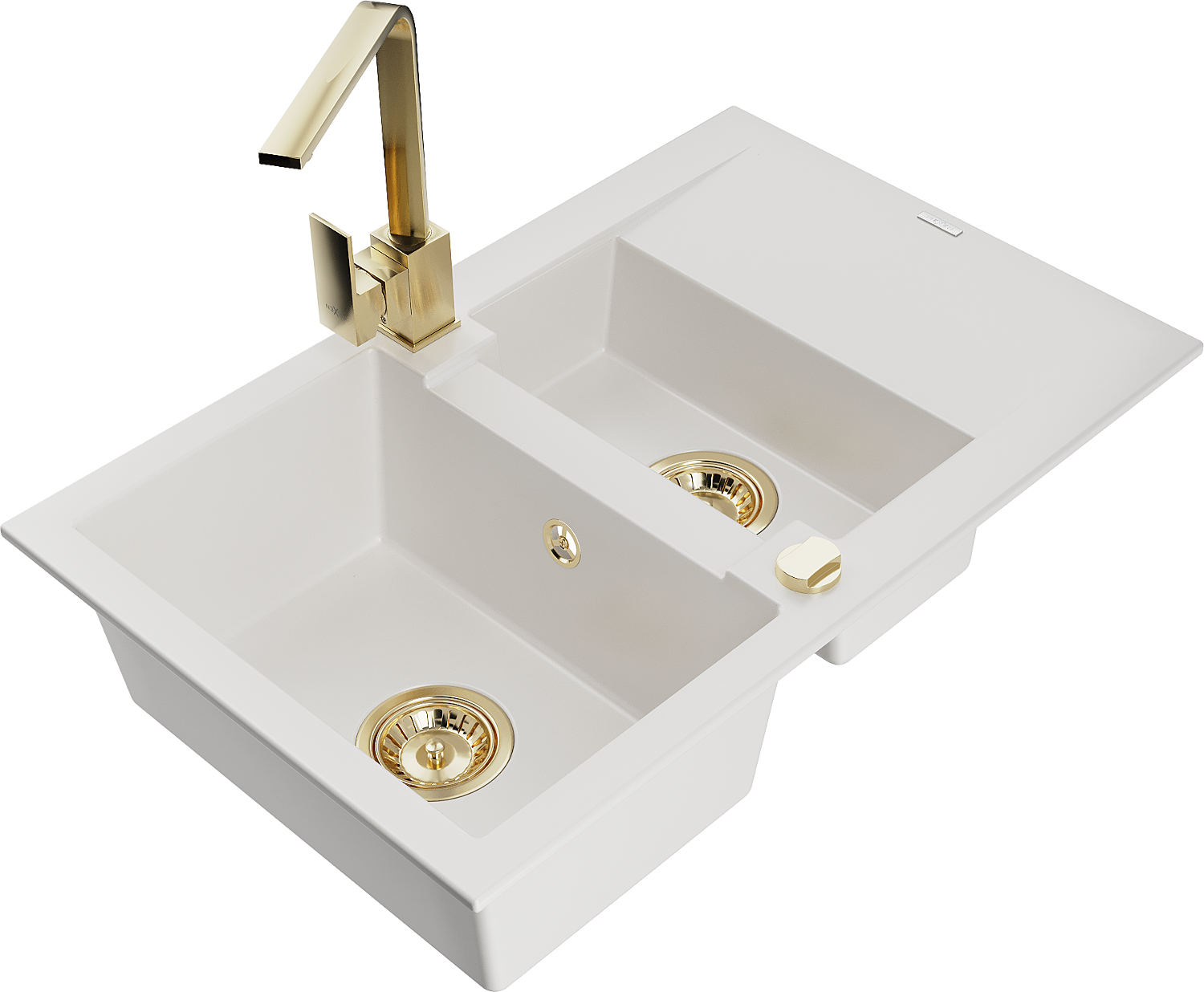 Mexen Gaspar granite sink 1.5-bowl with drainer and Rita kitchen tap, white - 6507-20-670300-50