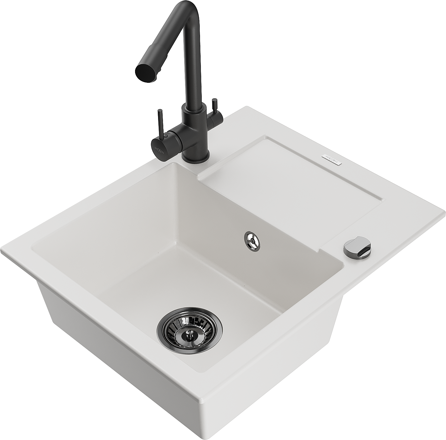 Mexen Enzo 1-bowl granite sink with drainer and Duero kitchen tap, white - 6506-20-671600-70
