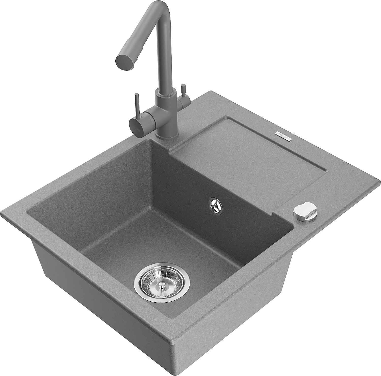 Mexen Enzo granite kitchen sink 1-bowl with drainer and Duero kitchen tap, grey - 6506-71-671600-71