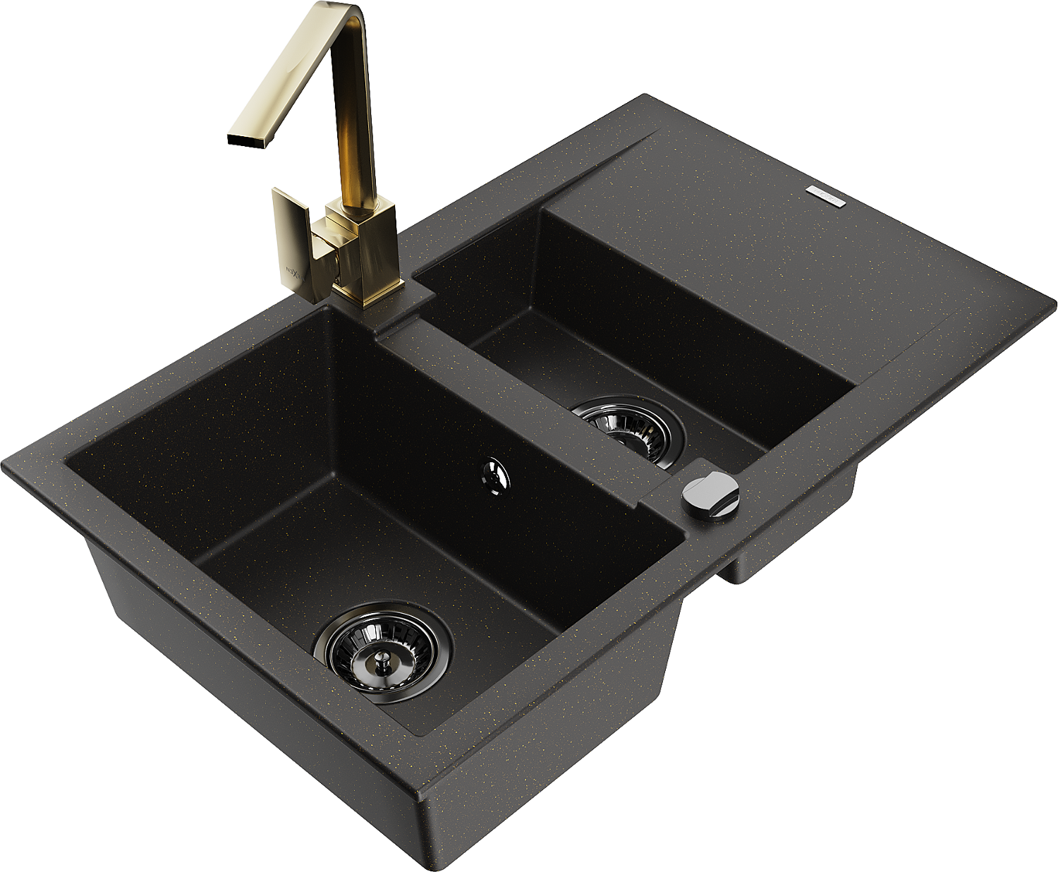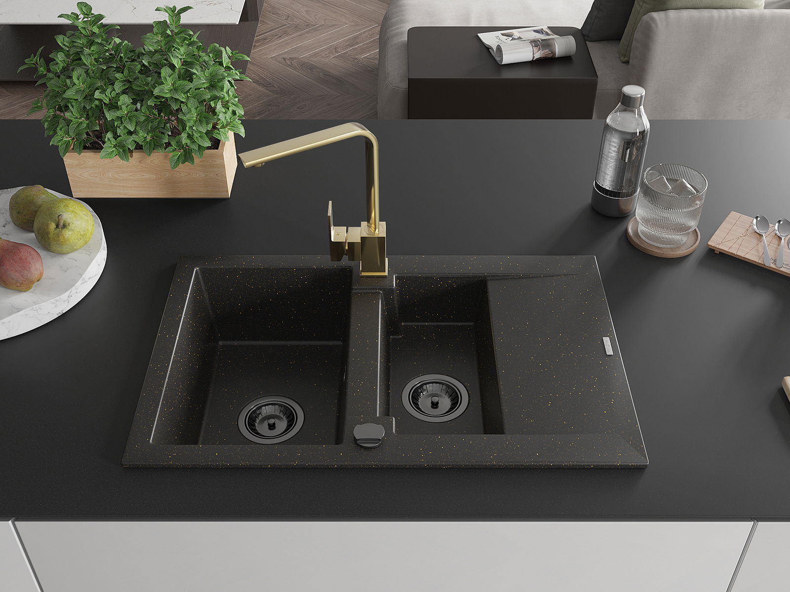 Mexen Gaspar granite sink 1.5-bowl with drainer and Rita kitchen tap, black/gold - 6507-75-670300-50-B