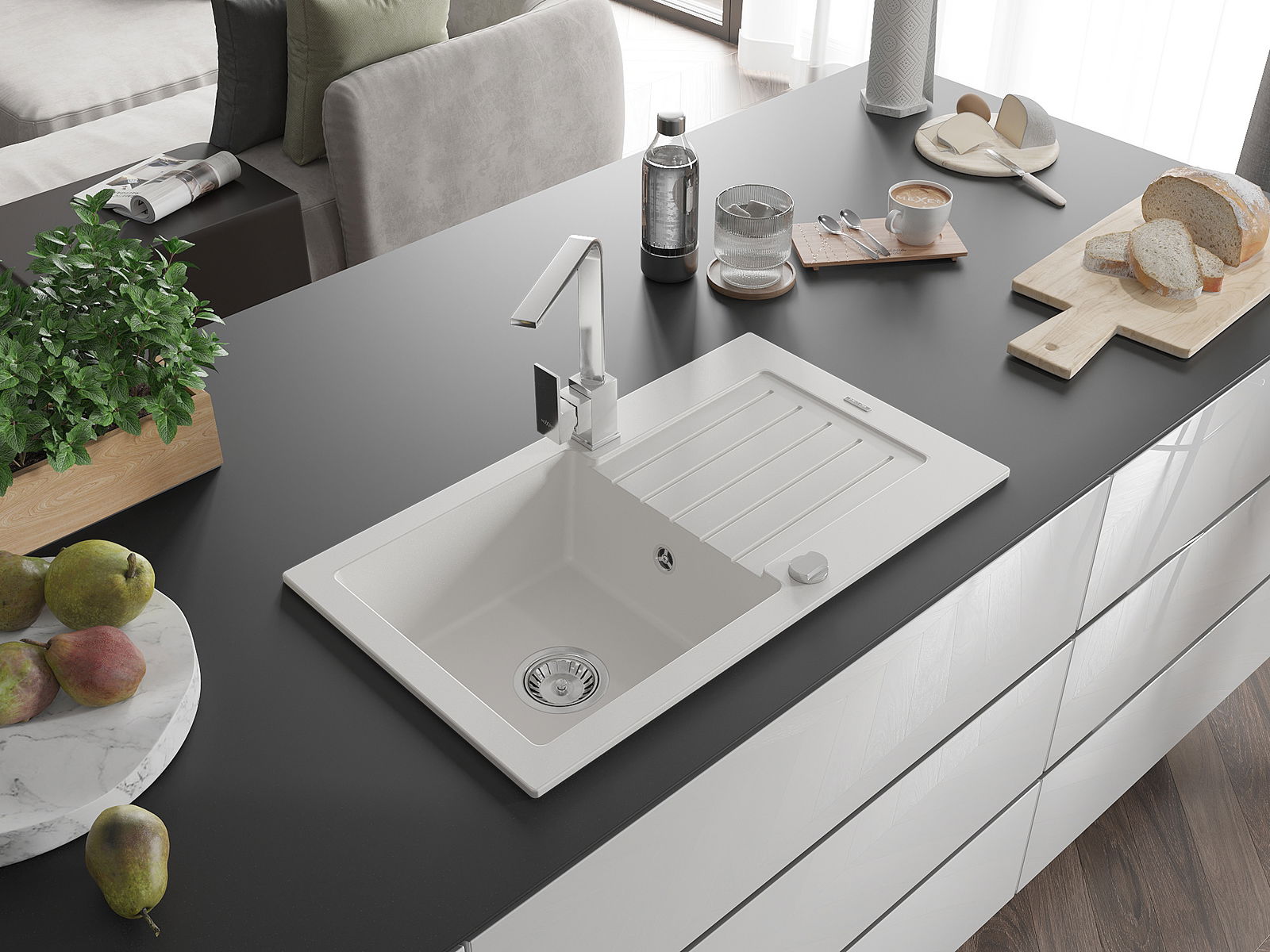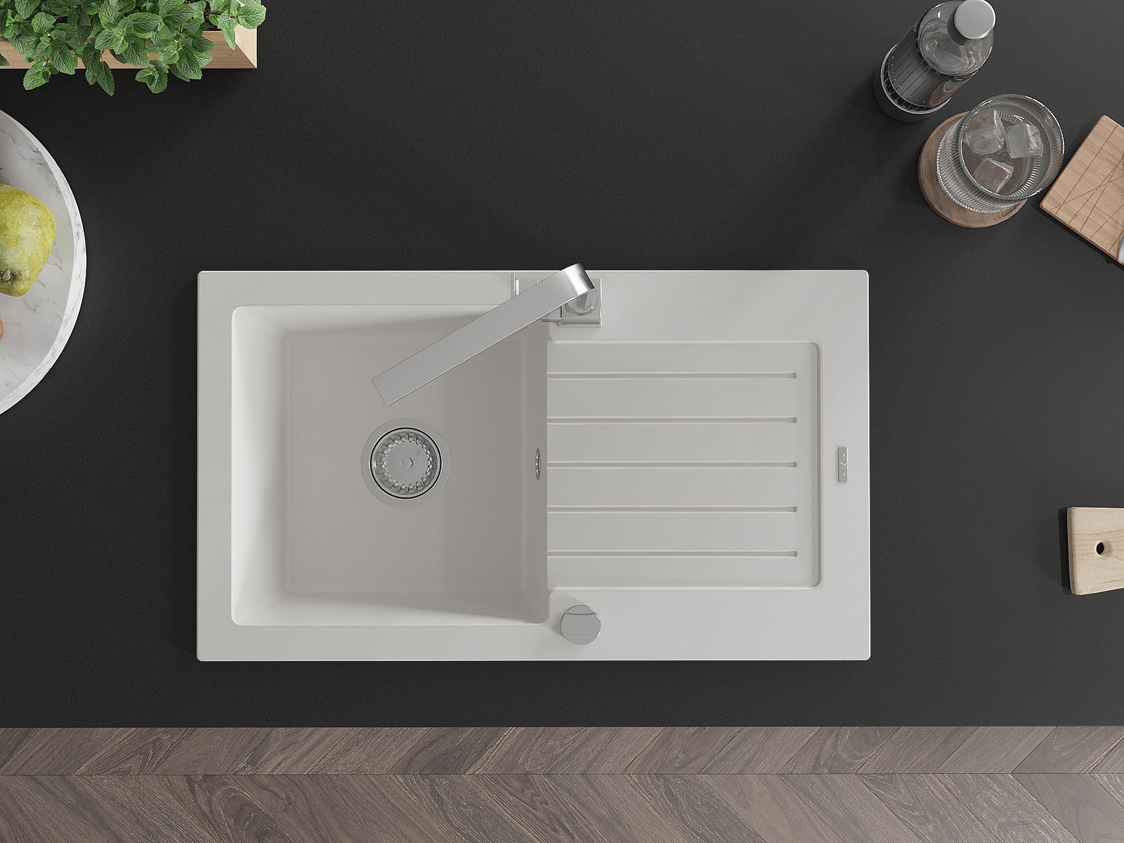 Choosing a sink with a draining board is a practical solution that allows you to set aside washed dishes or vegetables and fruits. The draining board makes daily cooking easier and helps maintain order in the kitchen.
