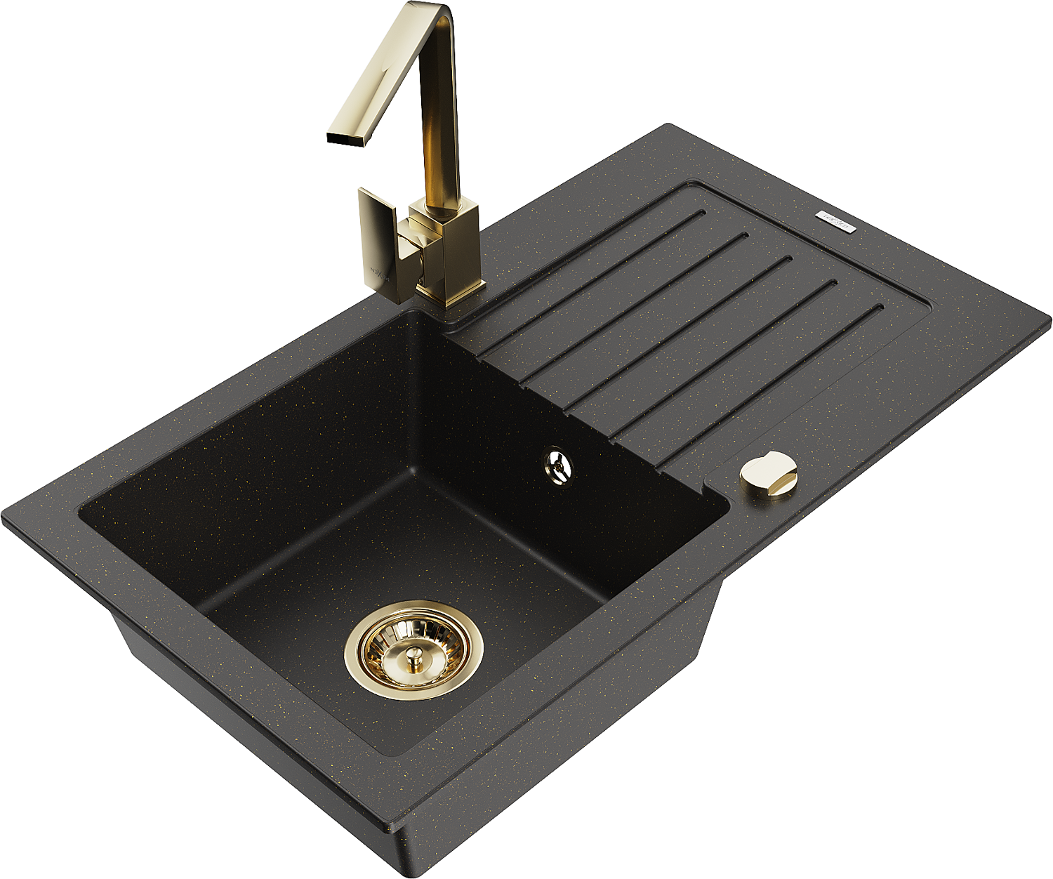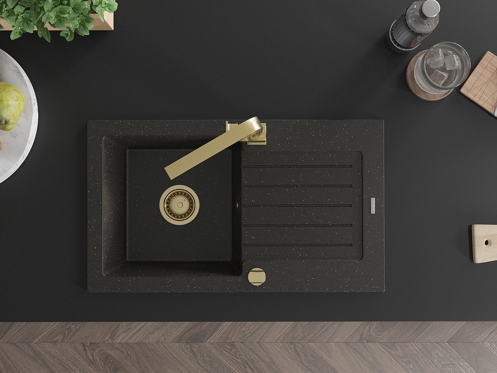 Mexen Pablo 1-bowl granite sink with drainer and Rita kitchen tap, black/golden metallic- 6510-75-670300-50