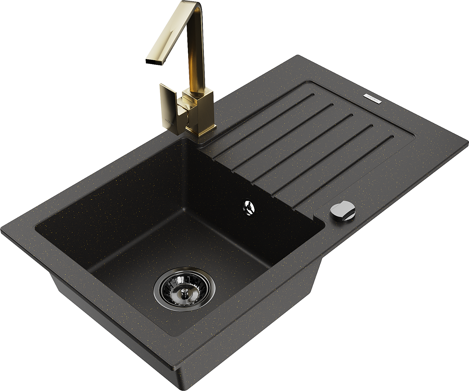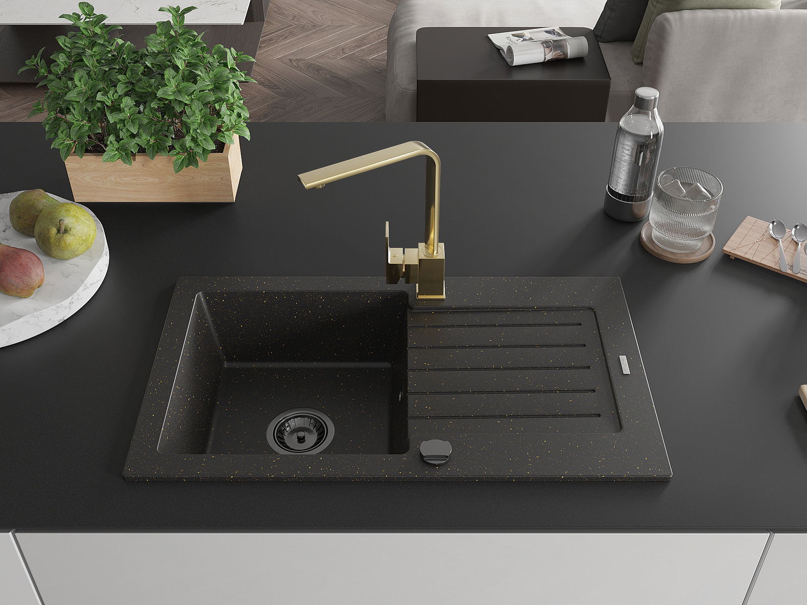 Mexen Pablo 1-bowl granite sink with drainer and Rita kitchen tap, black/golden metallic- 6510-75-670300-50-B