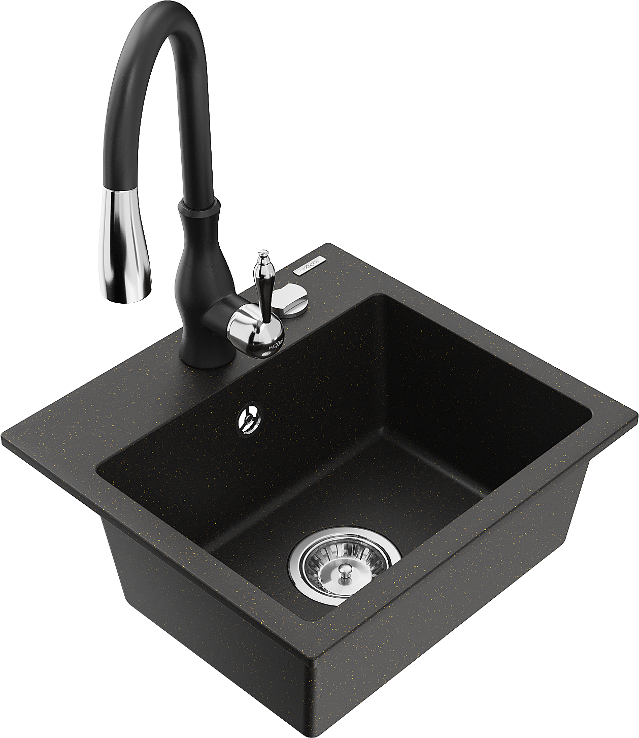 Mexen Milo single-bowl granite sink with Savita kitchen tap, black/gold metallic - 6505-75-672601-70