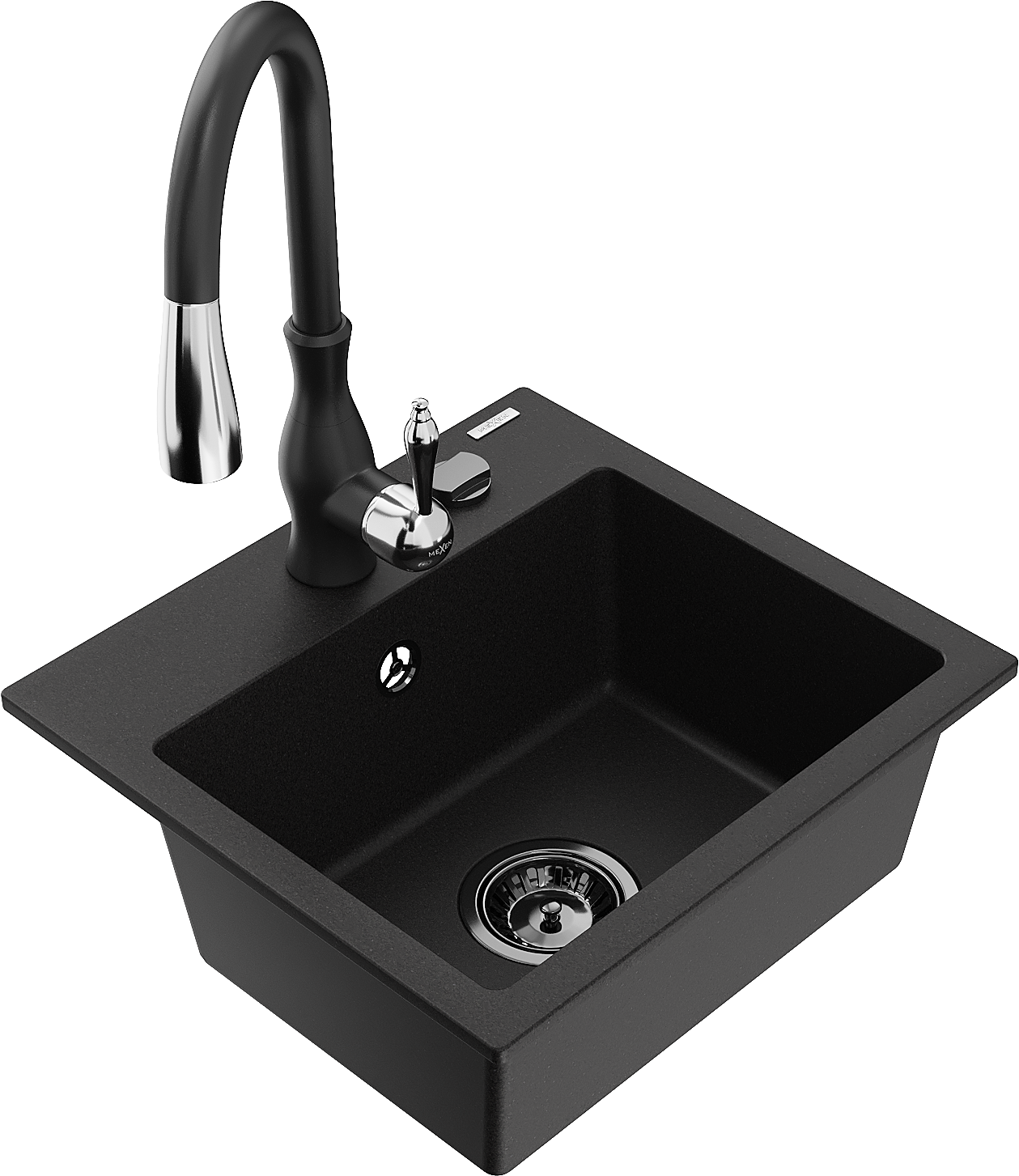 Mexen Milo Granite Sink 1-Bowl with Savita Kitchen Tap, Black - 6505-77-672601-70-B