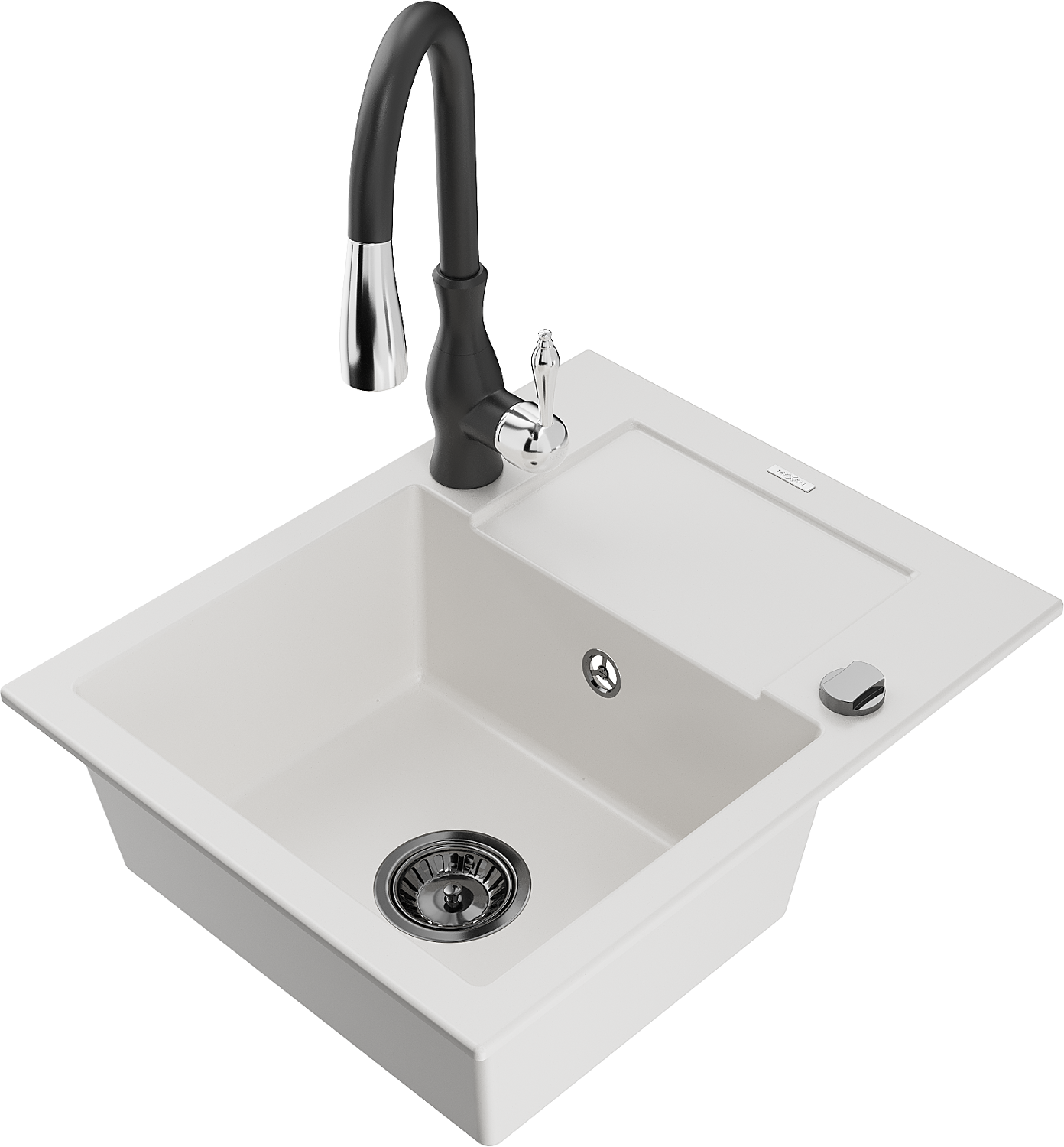 Mexen Enzo granite sink 1-bowl with drainer and Savita kitchen mixer, white - 6506-20-672601-70
