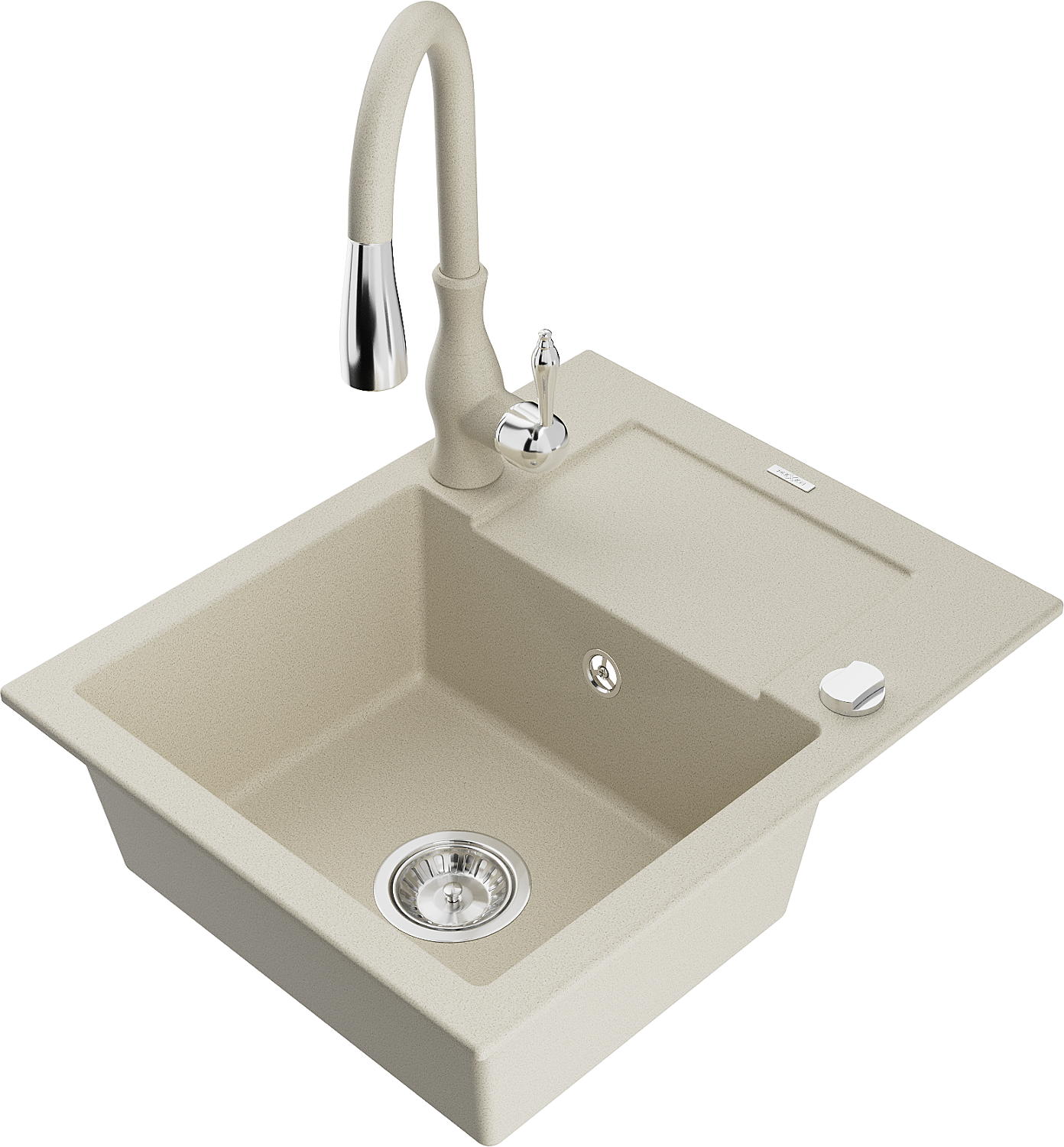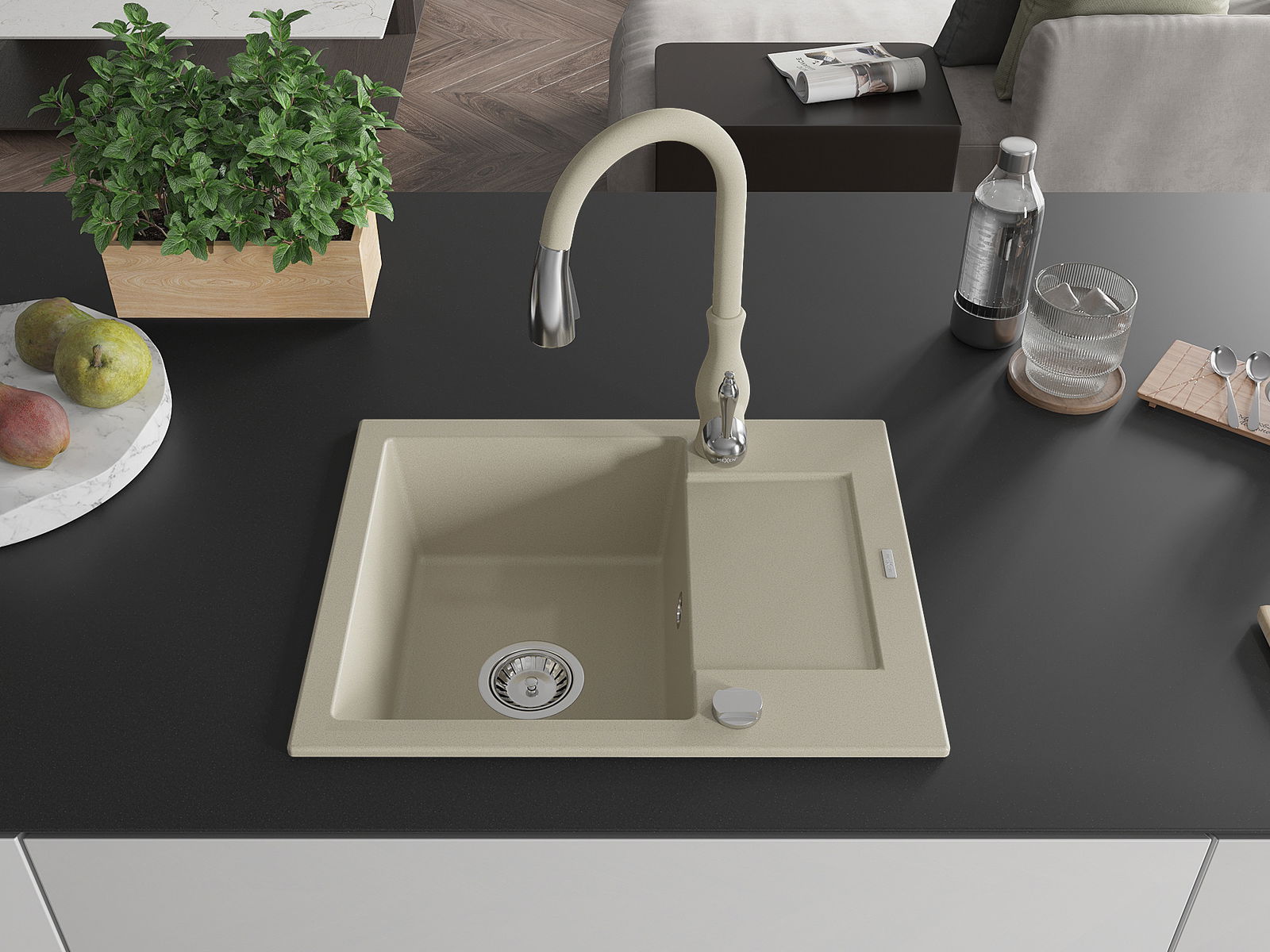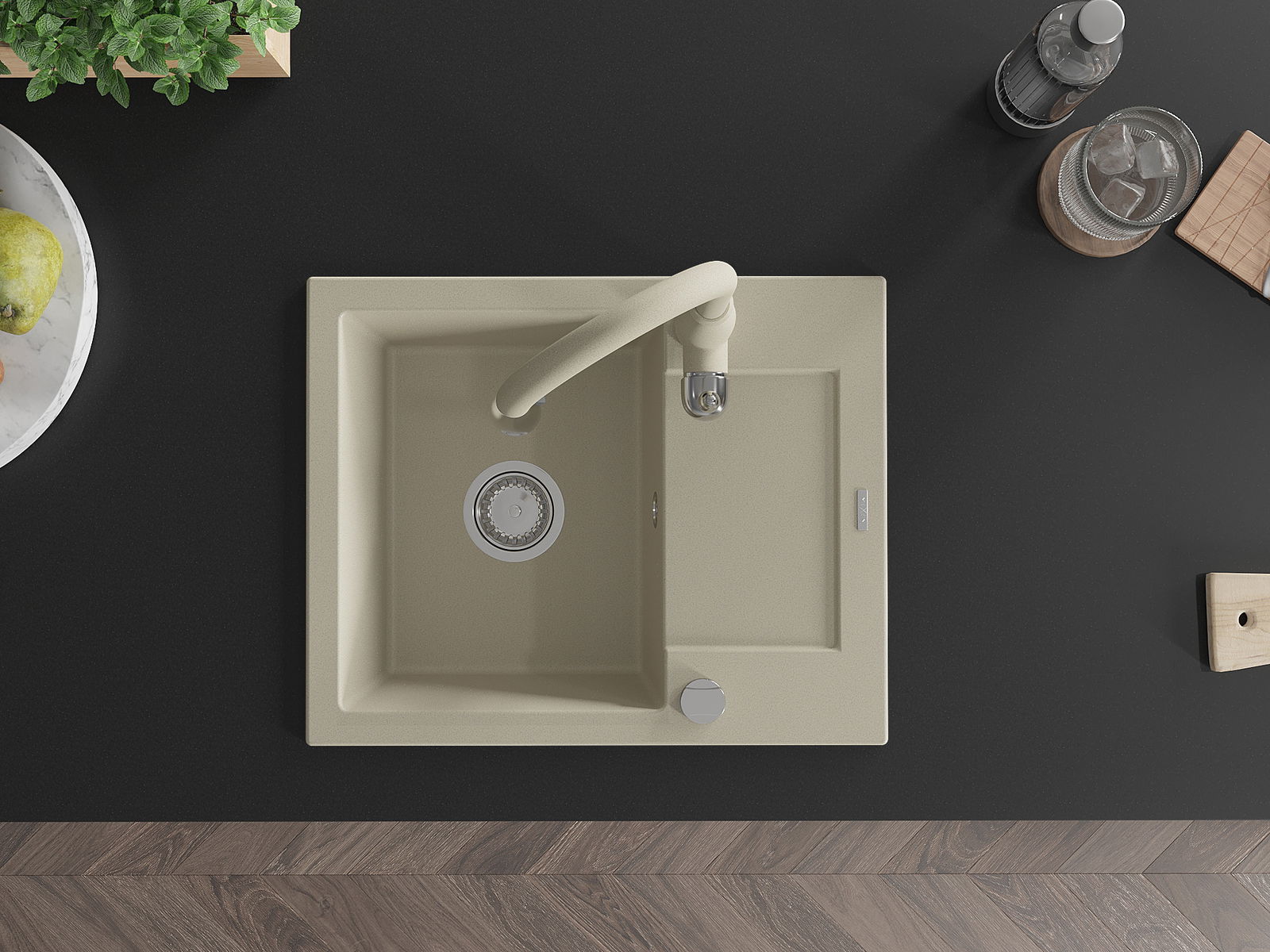Mexen Enzo 1-bowl granite kitchen sink with drainer and Savita kitchen tap, beige - 6506-69-672601-69