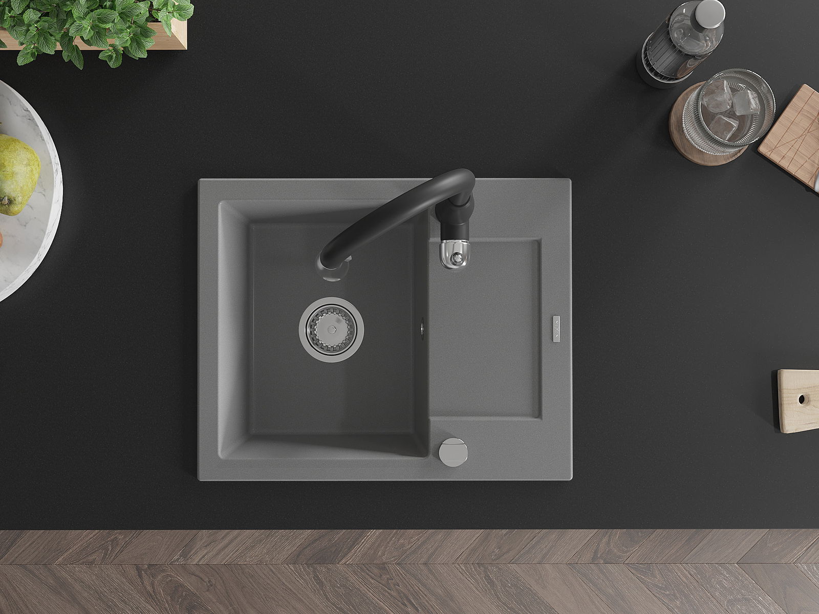 Mexen Enzo Granite Kitchen Sink 1-Bowl with Drainer and Savita Kitchen Tap, Grey - 6506-71-672601-70