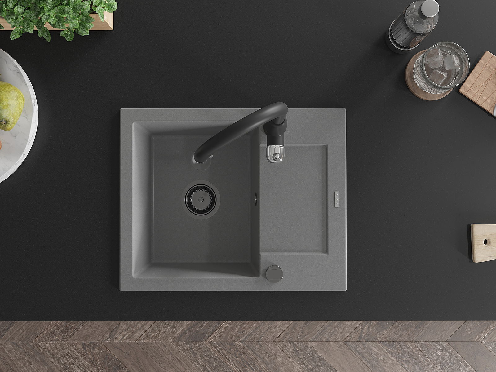 Mexen Enzo Granite Kitchen Sink 1-Bowl with Drainer and Savita Kitchen Tap, Grey - 6506-71-672601-70-B
