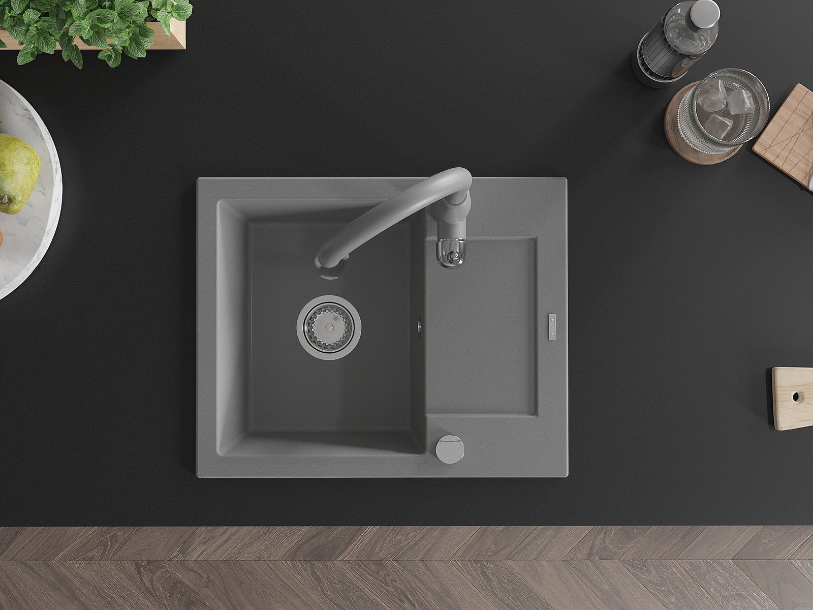 Mexen Enzo granite sink 1-bowl with drainer and Savita kitchen tap, grey - 6506-71-672601-71