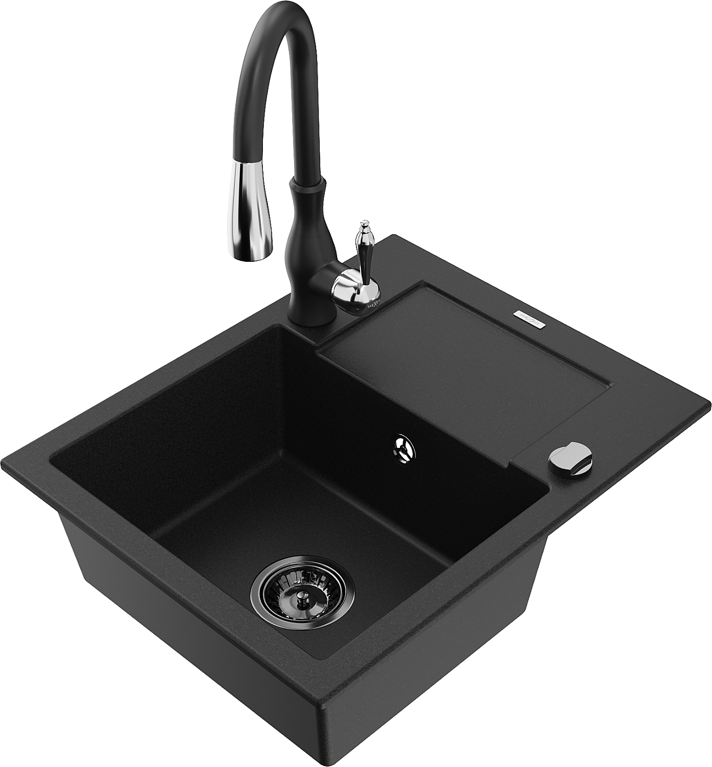 Mexen Enzo granite sink 1-bowl with drainer and Savita kitchen tap, black - 6506-77-672601-70-B