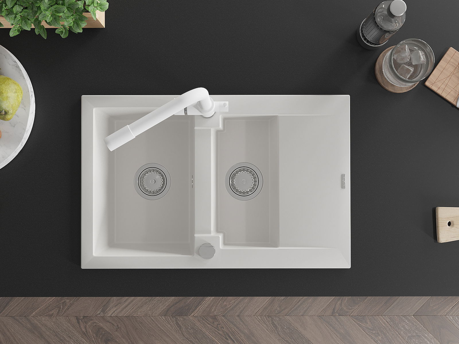 Mexen Gaspar 1.5-bowl granite sink with drainer and Duero kitchen tap, white - 6507-20-671600-20