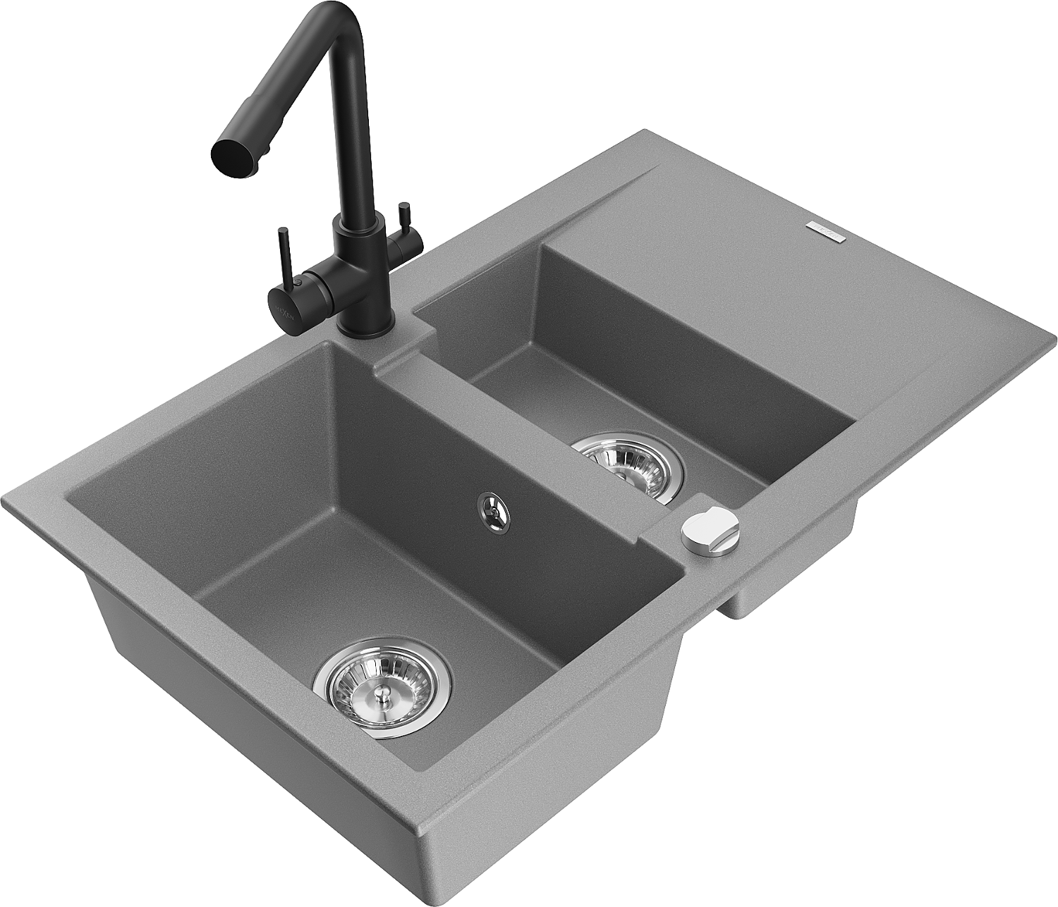 Mexen Gaspar granite sink 1.5-bowl with drainer and Duero kitchen tap, grey - 6507-71-671600-70
