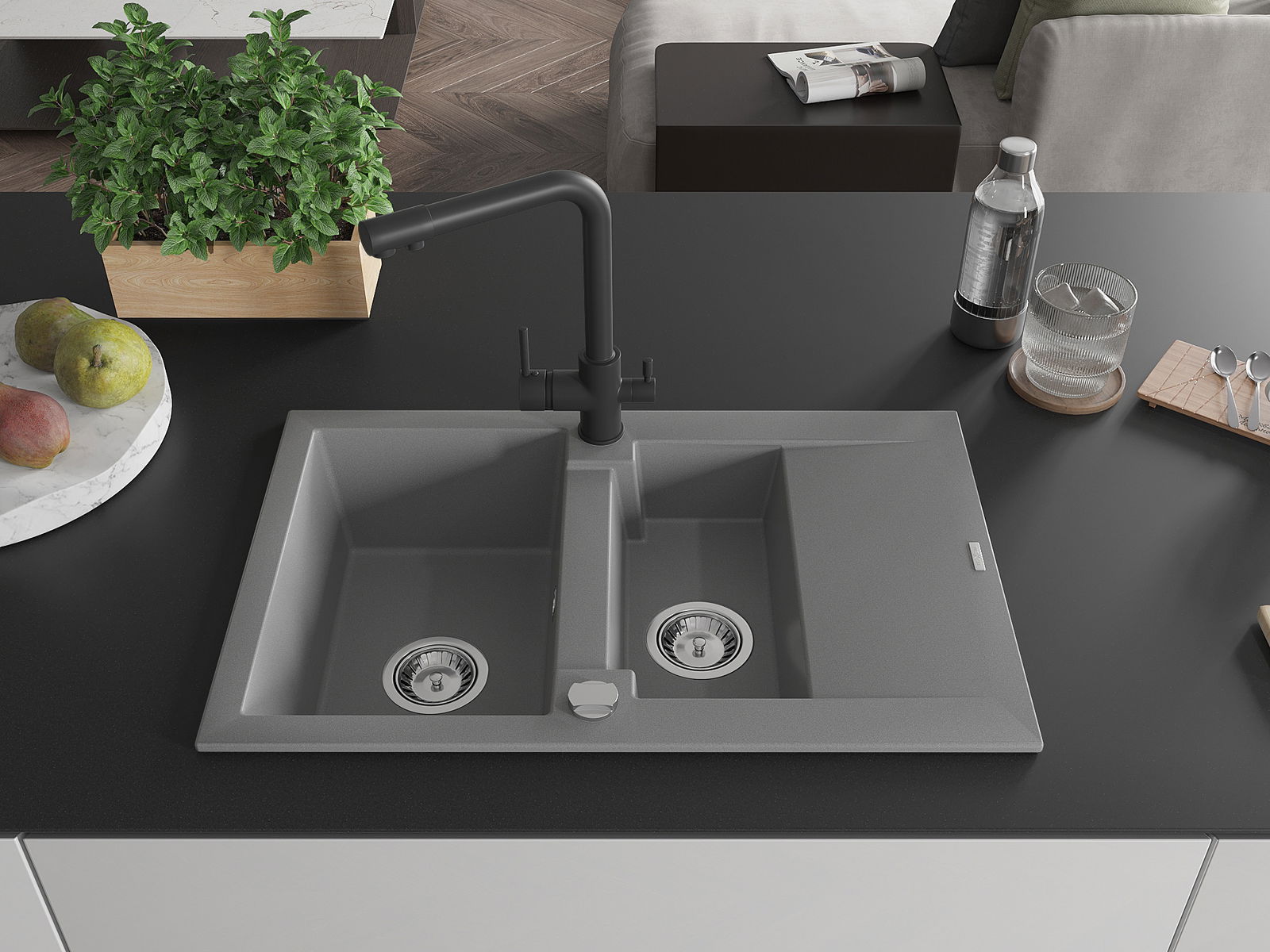 The sink is made of high quality granite. It is an elegant and, above all, practical complement to every kitchen, regardless of its style. High quality and granite durability ensure many years of use.