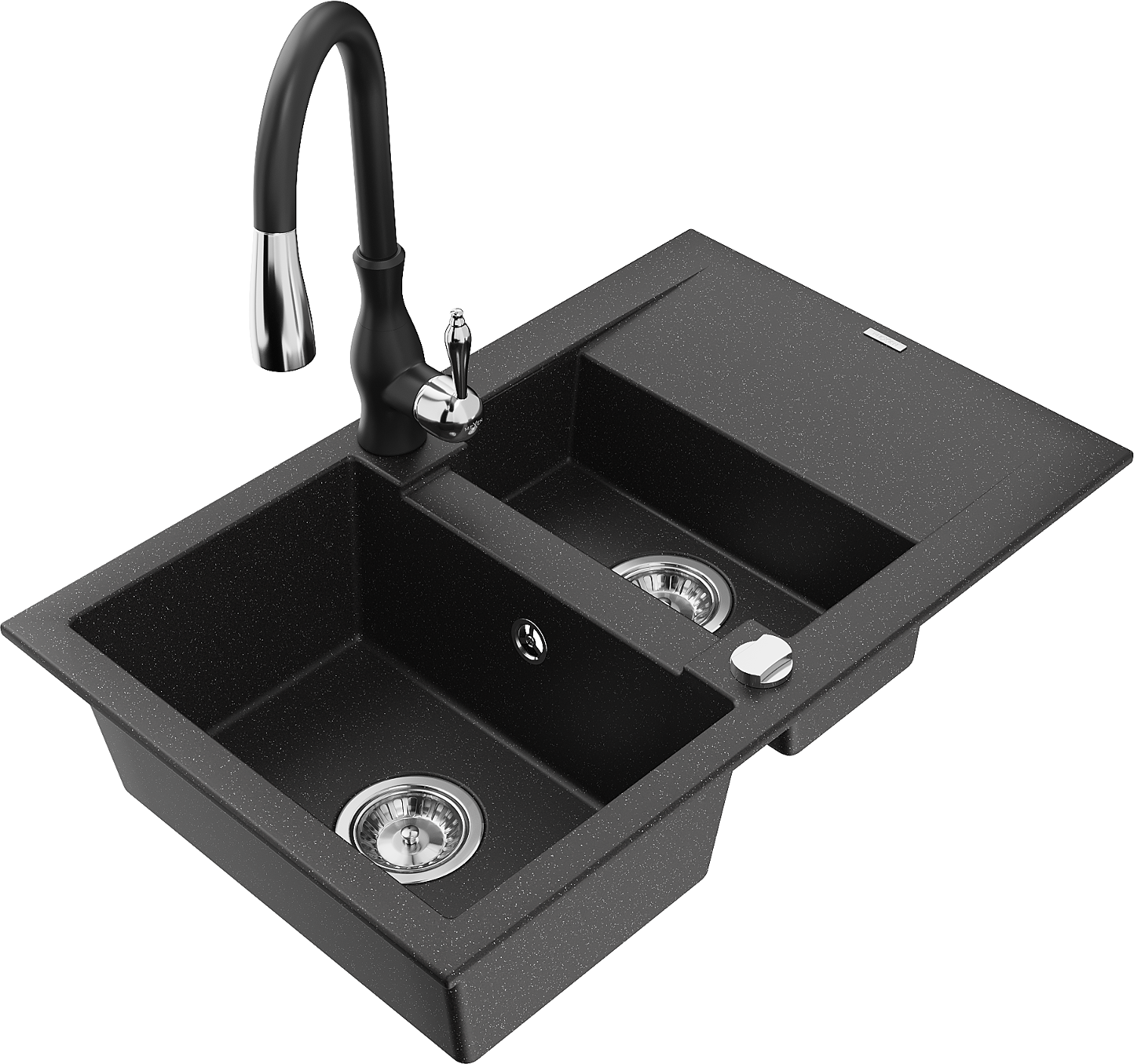 Mexen Gaspar granite sink 1.5-bowl with drainer and Savita kitchen tap, black/silver - 6507-73-672601-70