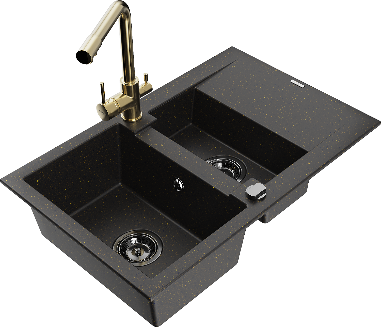 Mexen Gaspar granite sink 1.5-bowl with drainer and Duero kitchen tap, black/gold - 6507-75-671600-50-B