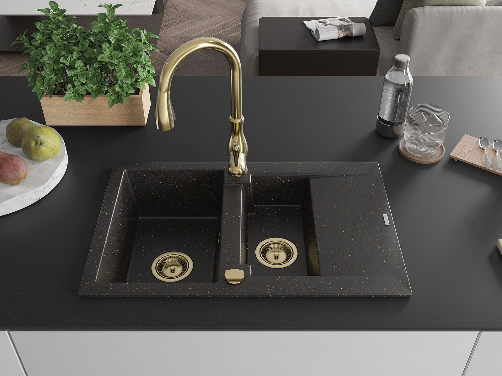 Mexen Gaspar granite sink 1.5-bowl with drainer and Savita kitchen tap, black/gold - 6507-75-672601-50