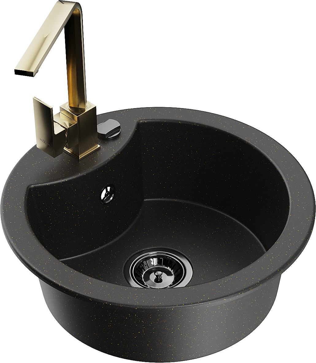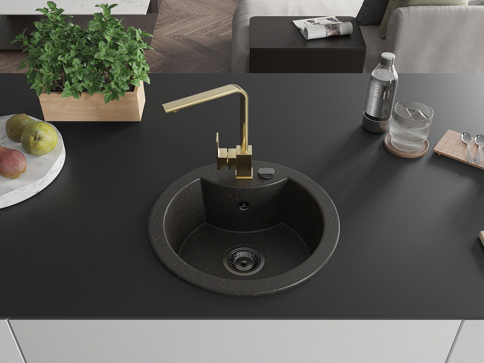 Mexen Diego granite sink 1-bowl with Rita kitchen tap, black/gold metallic - 6512-75-670300-50-B